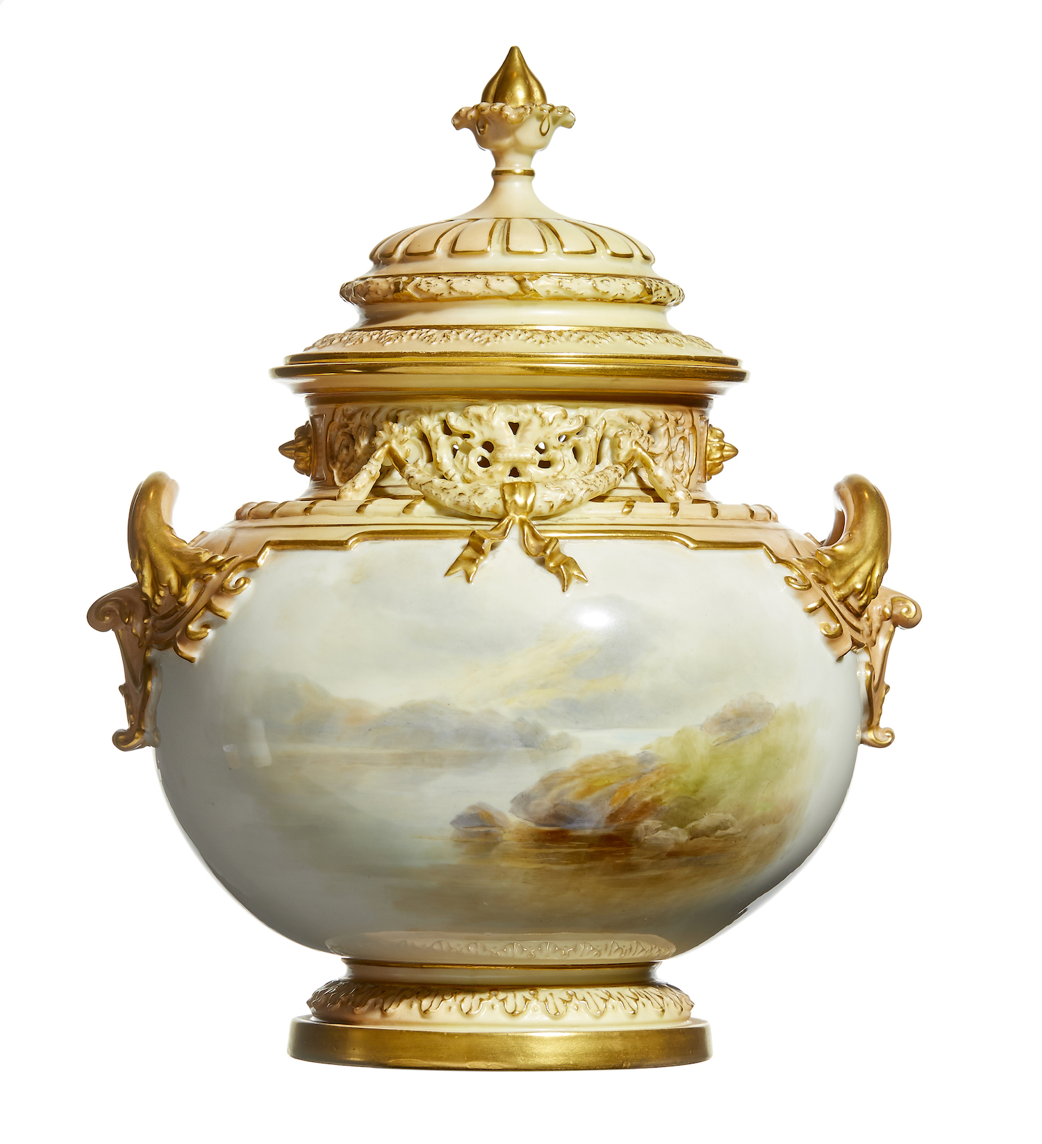 Painted Highland cattle in a stormy landscape and the reverse with a cloudy loche scene. Rd number 142778, shape number 1428.