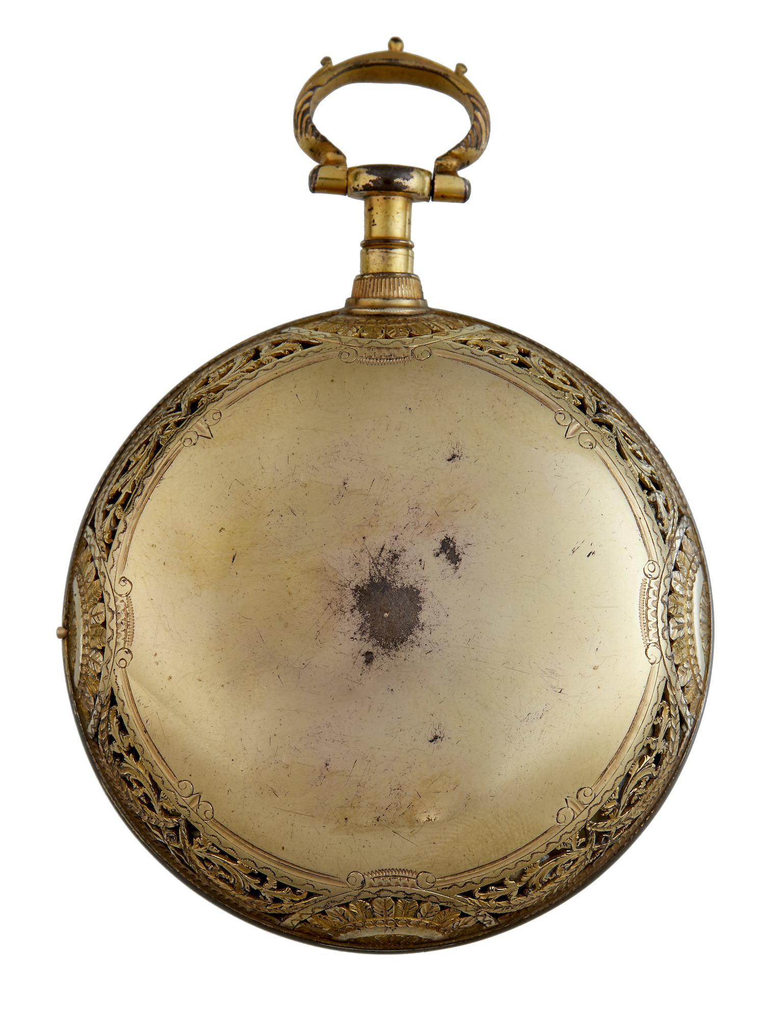 Outer case 6.5cm diameter, in good condition with minor wear to gilt at edged and on the plain centre back. Watch, 5cm diameter x 3cm height, in fine order with very minor age-expected wear to gold surfaces. Overall, in very good condition with no visible signs of repair or damage.
