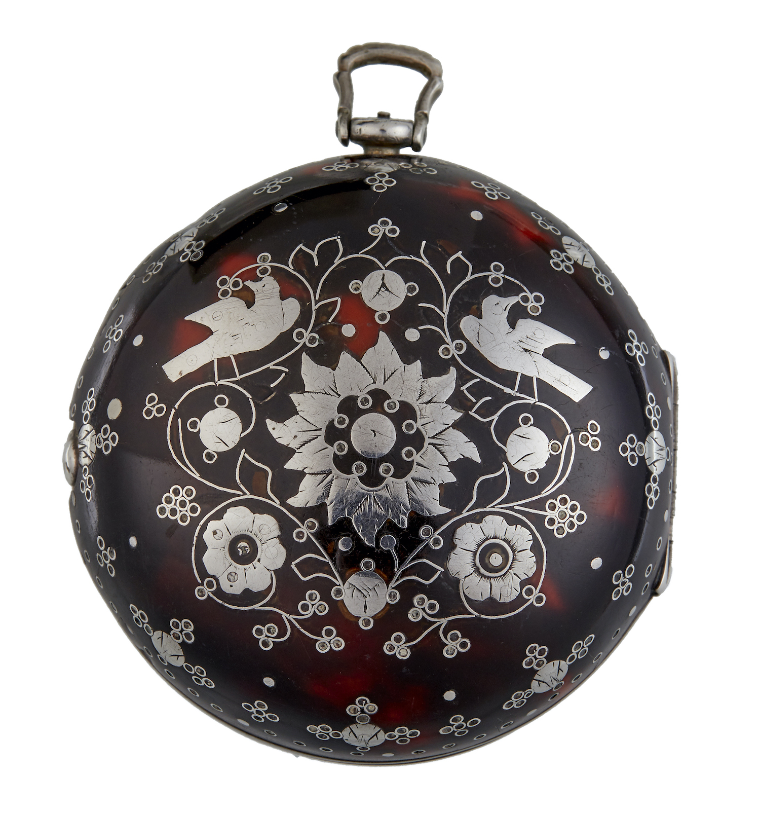 Deep full plate fire gilt movement with square pillars, fusee and chain with worm and wheel barrel setup between the plates. Pierced and engraved winged cock with mask, pierced and engraved foot. Plain steel balance, silver regulator disc. Movement signed 'Tho Utting, Yarmouth'. The silver champleve dial with Roman and Arabic numerals, signed 'Tho Utting', blued steel beetle and poker hands. Plain inner silver case stamped 'WB 1645'. Fine outer case covered in tortoiseshell which is inlaid with decorate foliate designs and birds.