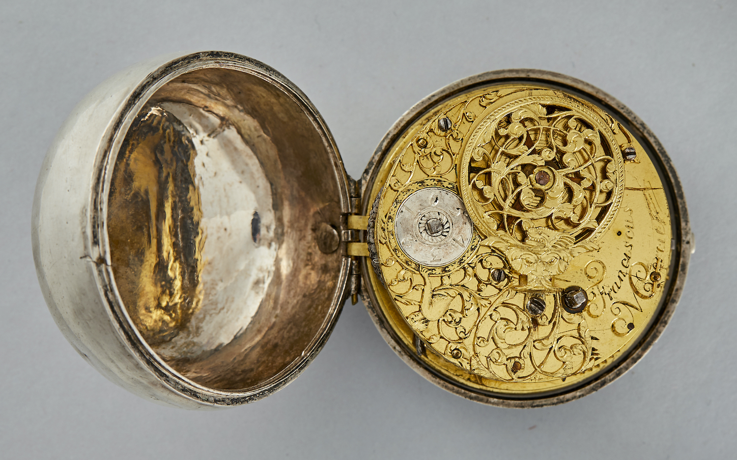 The frosted gilt chain fusee movement with finely pierced and engraved cock and foot secured by one screw, with the tail to the edge of the top-plate, other pierced and engraved furniture containing a mythical figure as indicator for the silvered regulation disc, pierced and faceted tulip pillars with mythical fish design, the finely engraved gilt champleve dial with black enamel Roman numerals, guilded central section with a silvered disc for aspects of the moon, outer calendar chapter ring. The plain silver inner case with bullseye glass. The shagreen covered outer case with silver pin work. The movement signed 'Franciscus Mercier'.