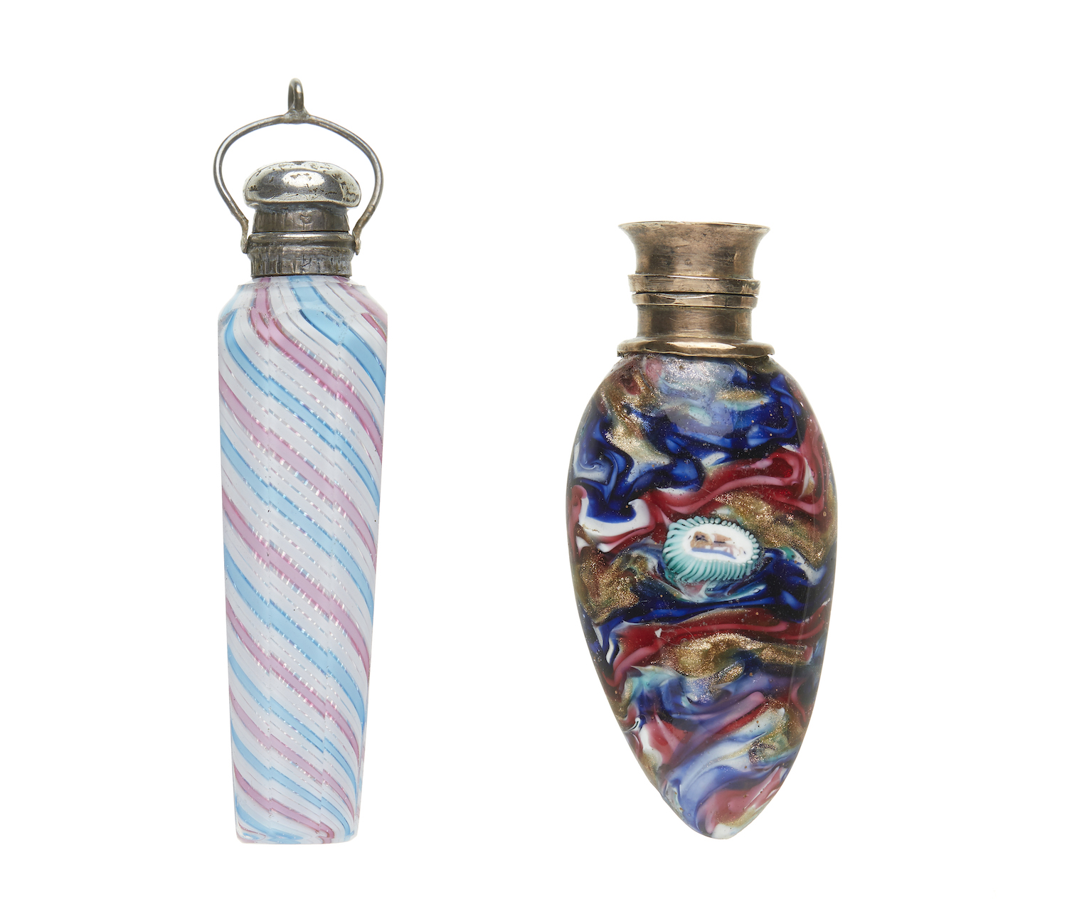 One millefiori glass with gold hinged top and glass stopper; one Venetian glass tapered octagonal body striped in blue pink and white, silver hinged top, glass stopper; one French with gilt metal overlay with central limoges style tablet of a courting couple; and one red glass with gilt metal filigree overlay and hinged top and glass stopper.