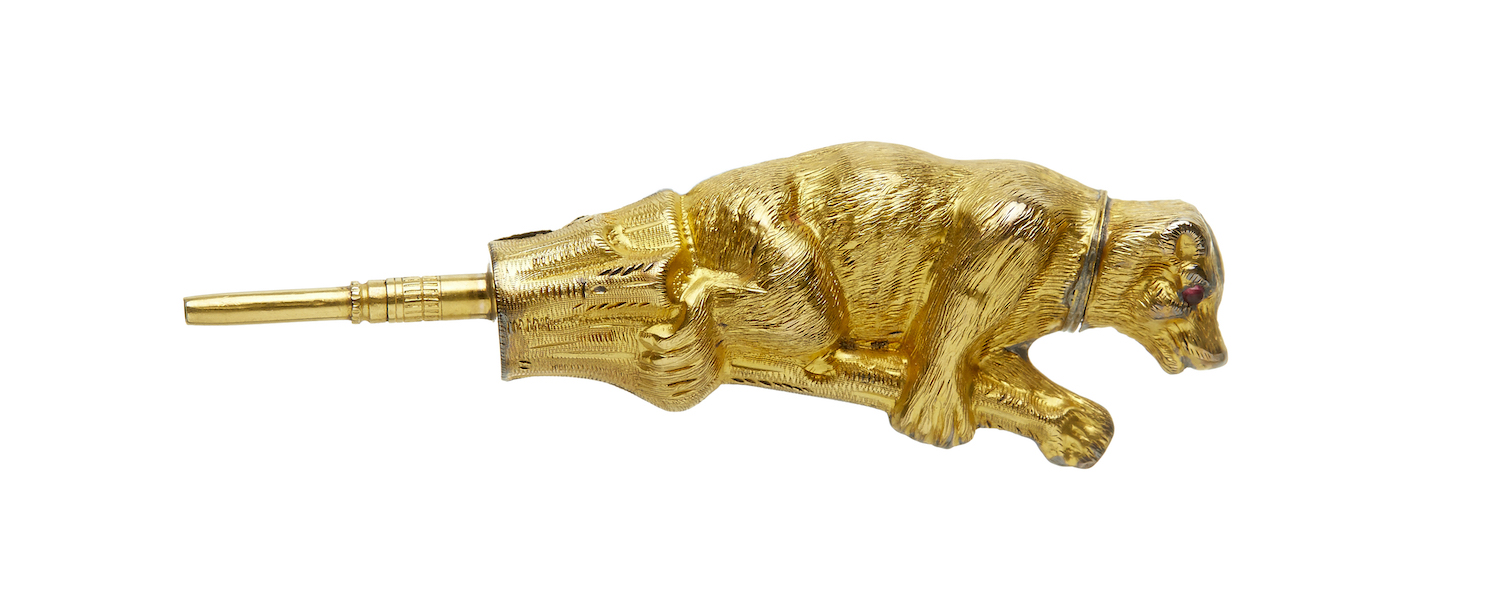 One in the form of a leaping fox, the other a bear on a branch with red stone eyes.
