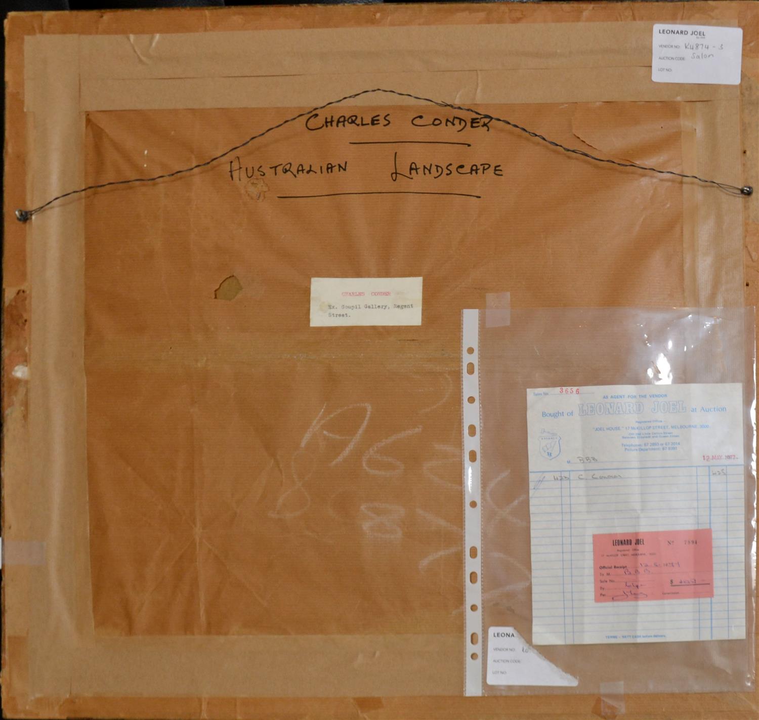 LEONARD JOEL, 11/05/1977, LOT 423 (AS CHARLES CONDER). CONDITION REPORT: IN FAIR CONDITION, A SURFACE ABBRASION RUNNING ALONG RIGHT HAND EDGE. OVERALL SIZE INCLUDING FRAME 58 X 62CM.