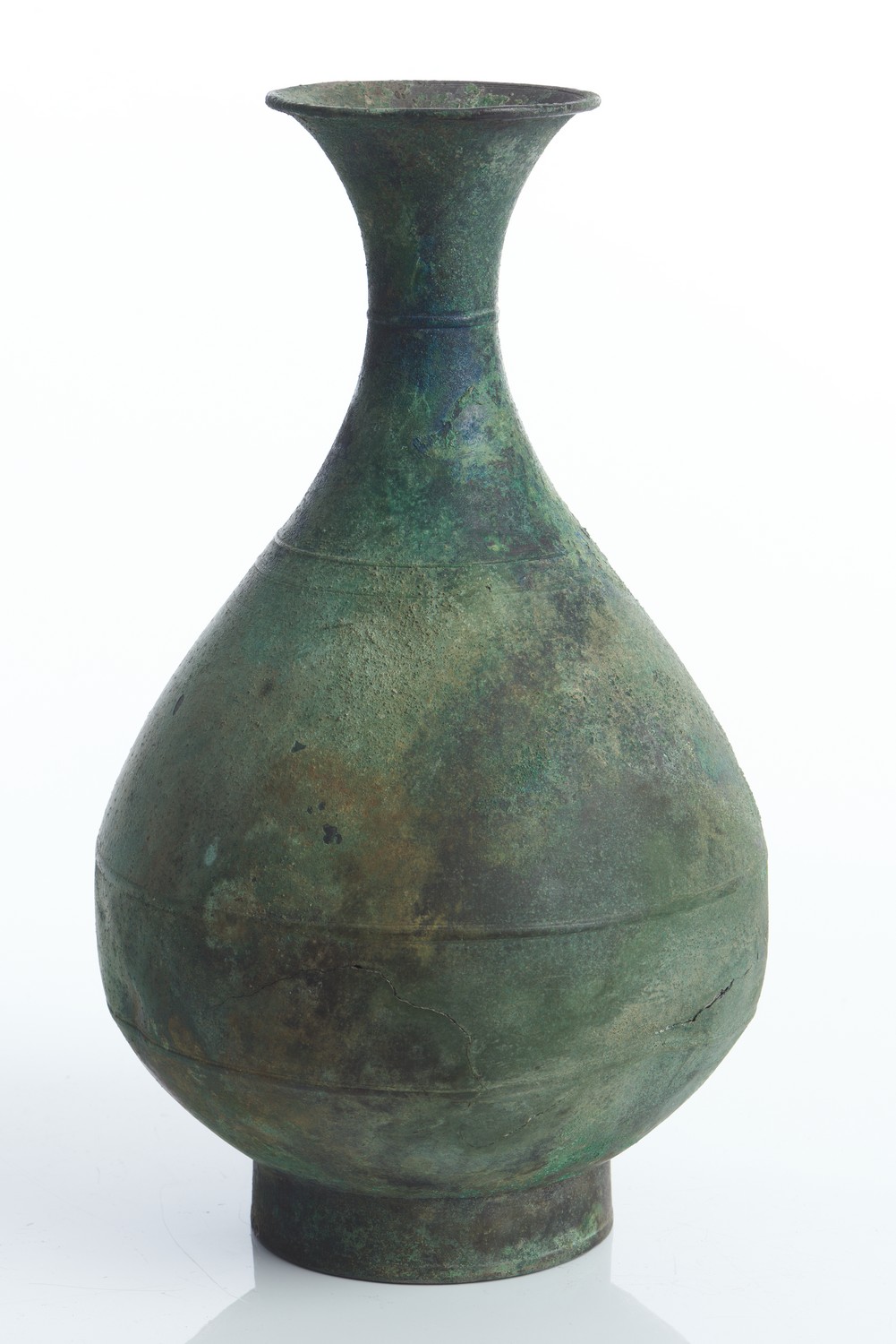 Of classic Chinese 'yuhuchunping' pear form with a high foot, displaying a deep verdigris and azurite patina.