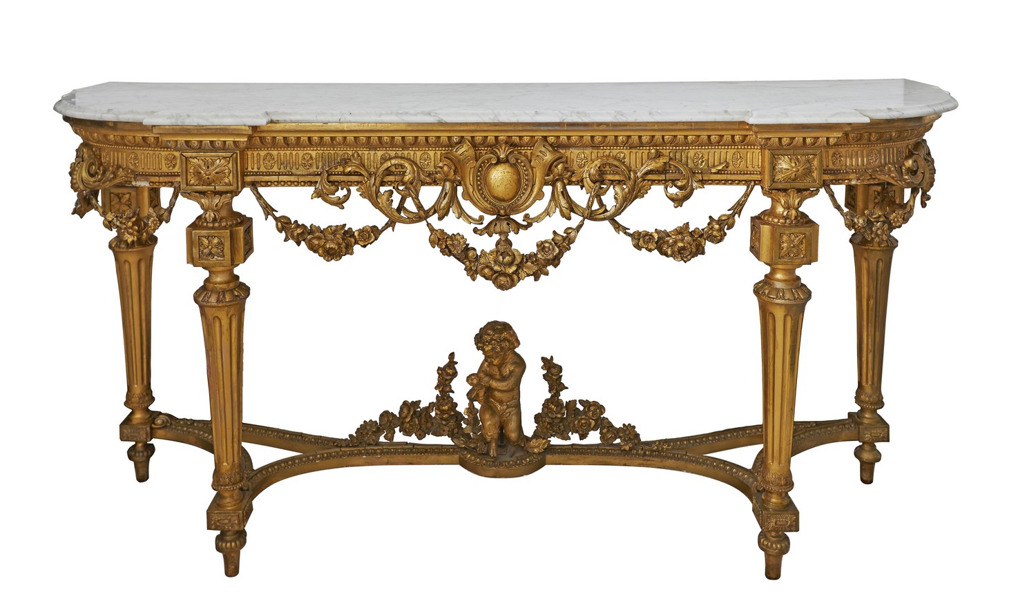 The mirror with shaped top surmounted with a cymbal playing putto, the beaded frame with applied fluted elements richly swagged with flowers, flanked by scrolls above a table. The table having a white marble D shaped top on a fluted rosette frieze centred with a cartouche, foliate scrolls and flower swags, on tapering fluted supports united by a shaped undertier with a central putto with dove.