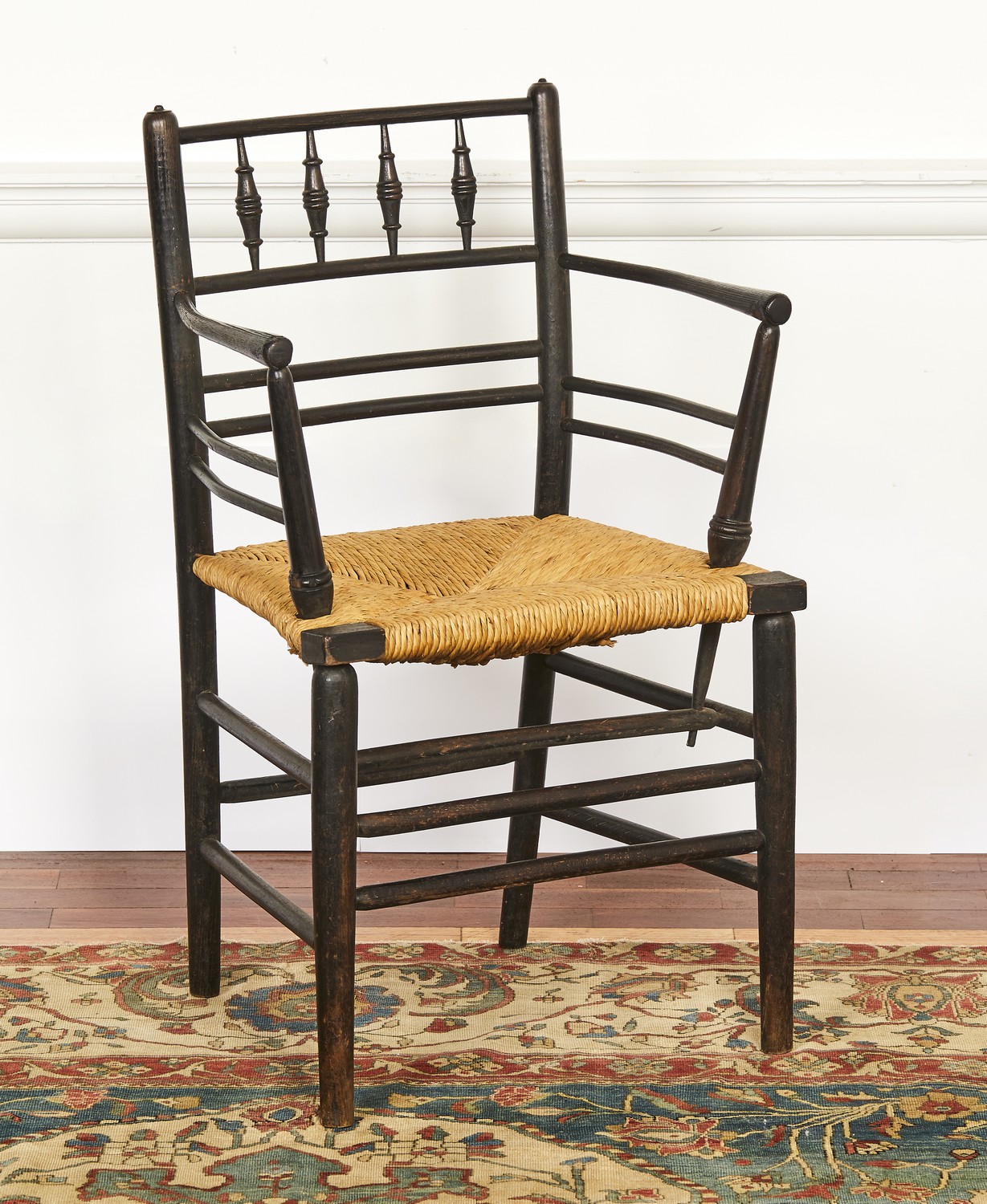 Each with turned uprights, spindle back detail, rush seat, and turned stretchers (2).