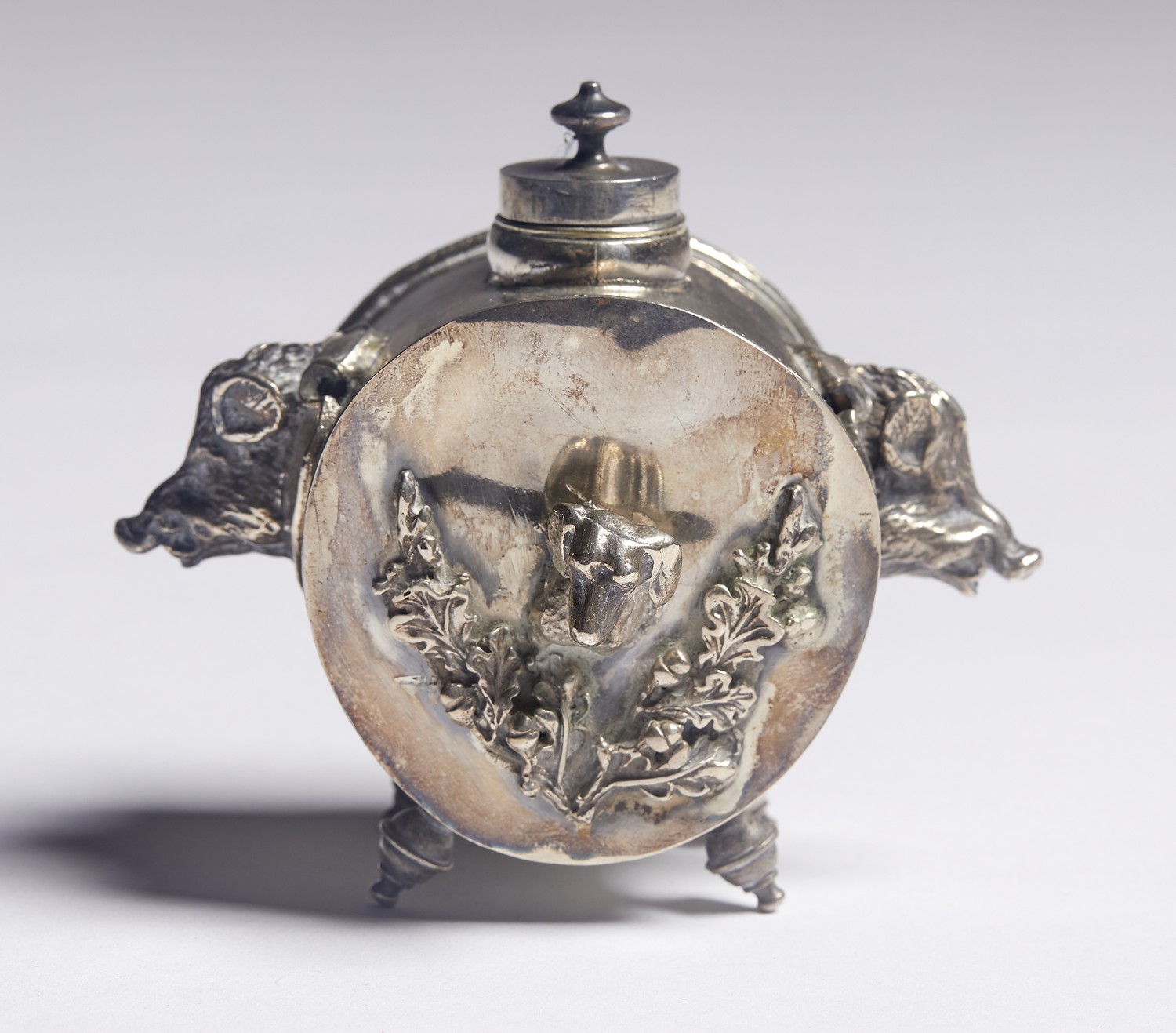 Comprising a pair of Victorian serving spoons, London 1895 with shell bowls and spiral twist handles with seal knops; a Continental tea strainer; a small Polish silver cylindrical inkwell, Warsaw 1878 with boars' head and hound decoration, and an oval Continental silver tray with a lobate border (5).