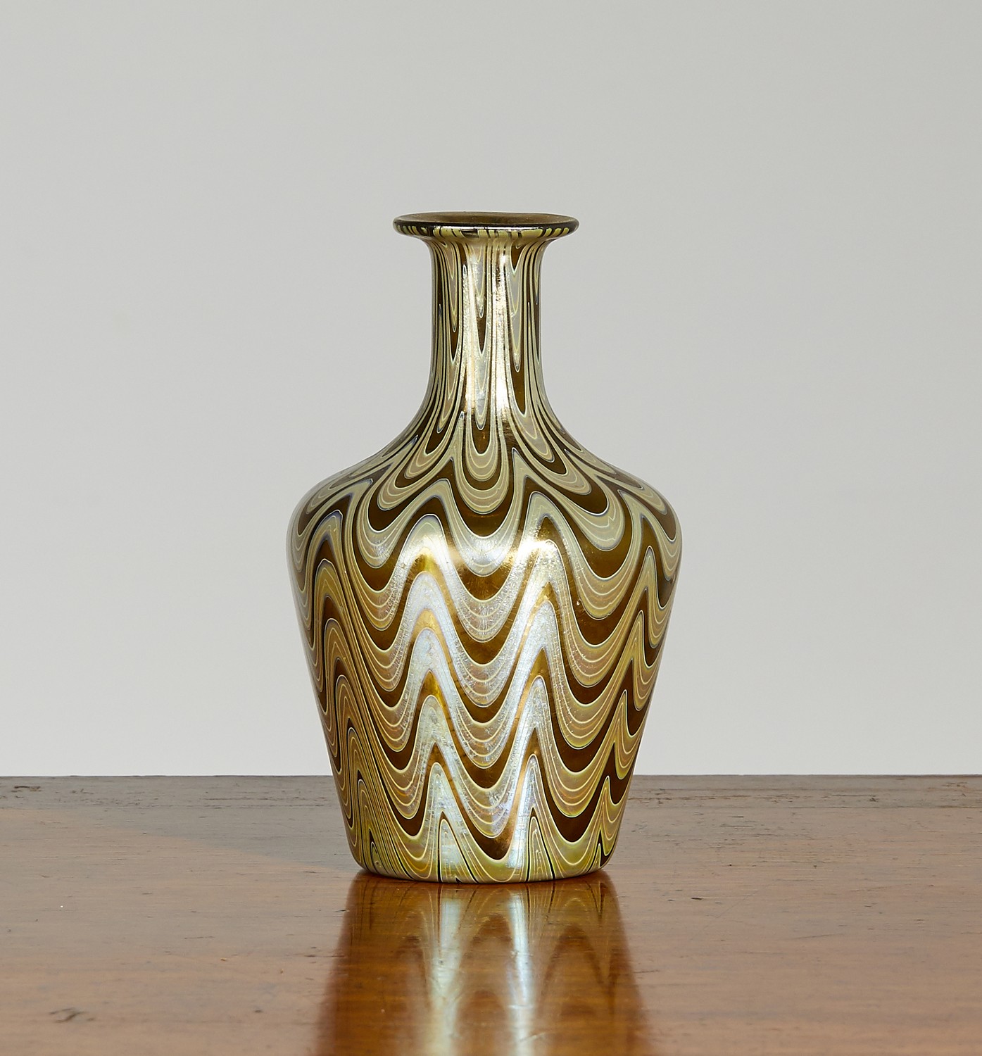 A small bottle vase with blue and gold iridescent pattern and an ovoid vase with blue iridescent pattern on yellow ground.