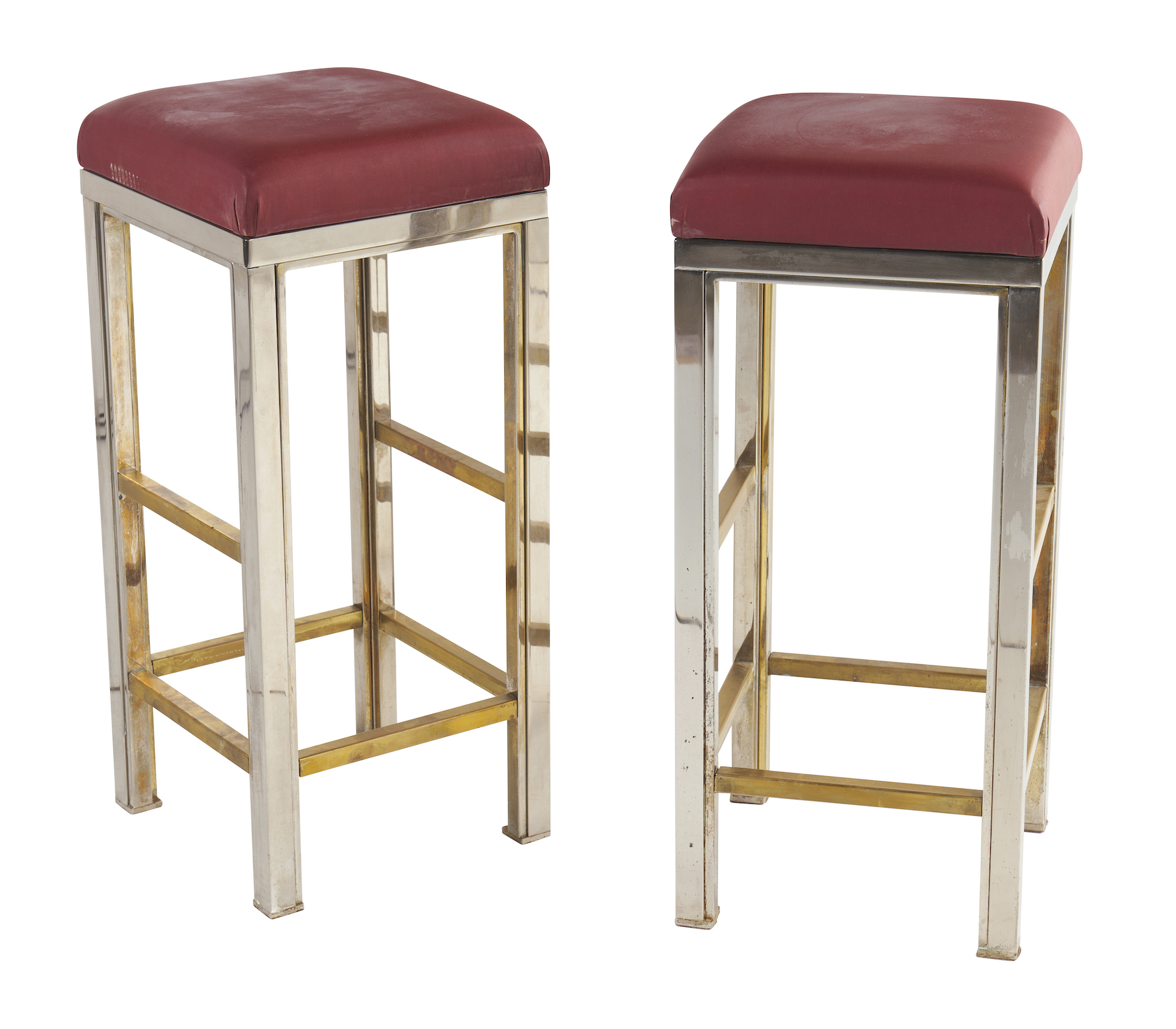 Red glass, chrome and brass. Bar stools covered in red vinyl uphostery