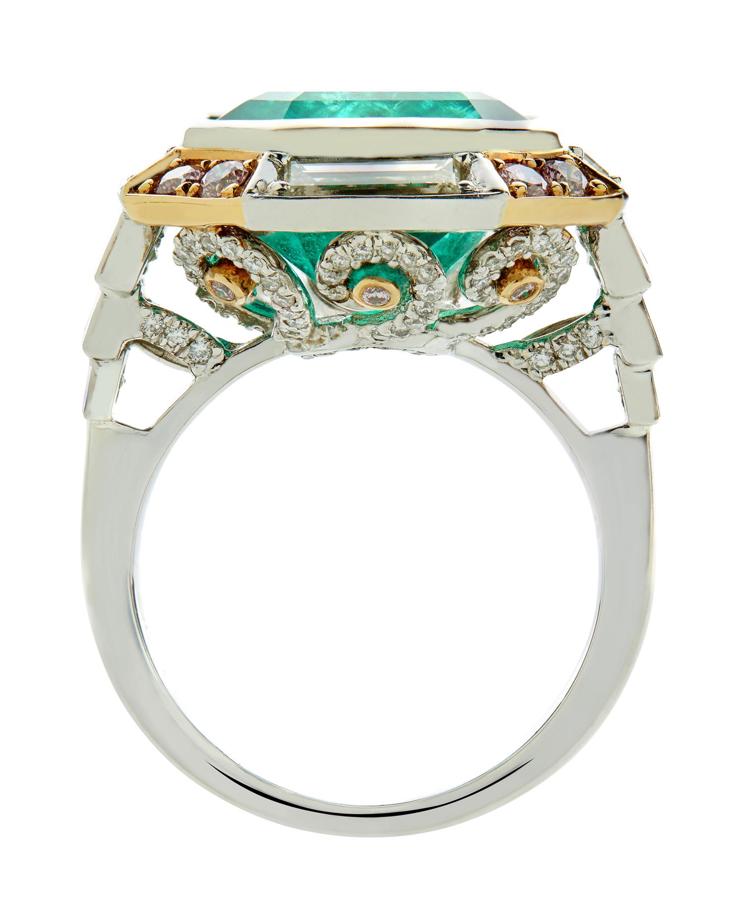 Of cluster design, centring on an octagonal step-cut Columbian emerald weighing 9.73 carats, collet-set within a surround of baguette diamonds between spacers pavé-set with Argyle natural fancy pink brilliant-cut diamonds to graduated baguette shoulders, the gallery decorated with scrolls embellished with Argyle natural fancy pink and near colourless brilliant diamonds, the pink and near colourless diamonds together weighing approximately 0.31 carats and 2.01 carats respectively, size K.
