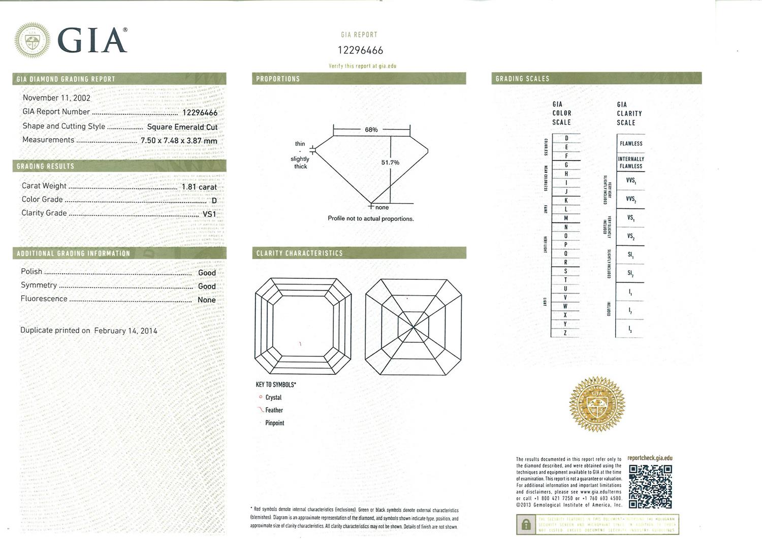 a GIA report numbered 12296466, dated 11 November 2002, stating that the 1.81 carat diamond is D colour and VS1 clarity, laser inscribed;