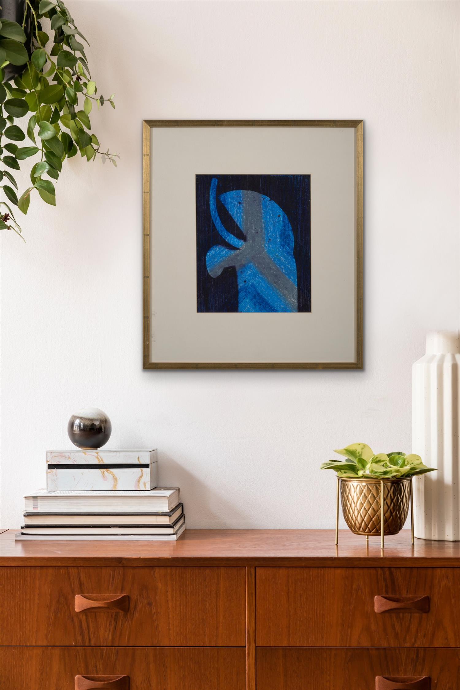 Work is in very good condition. Light, hairline cracking in the surface of the paint in evident in the lower left and right corners (areas of heavy dark pigment). Framed, with overall size: 52.5 x 46cm
