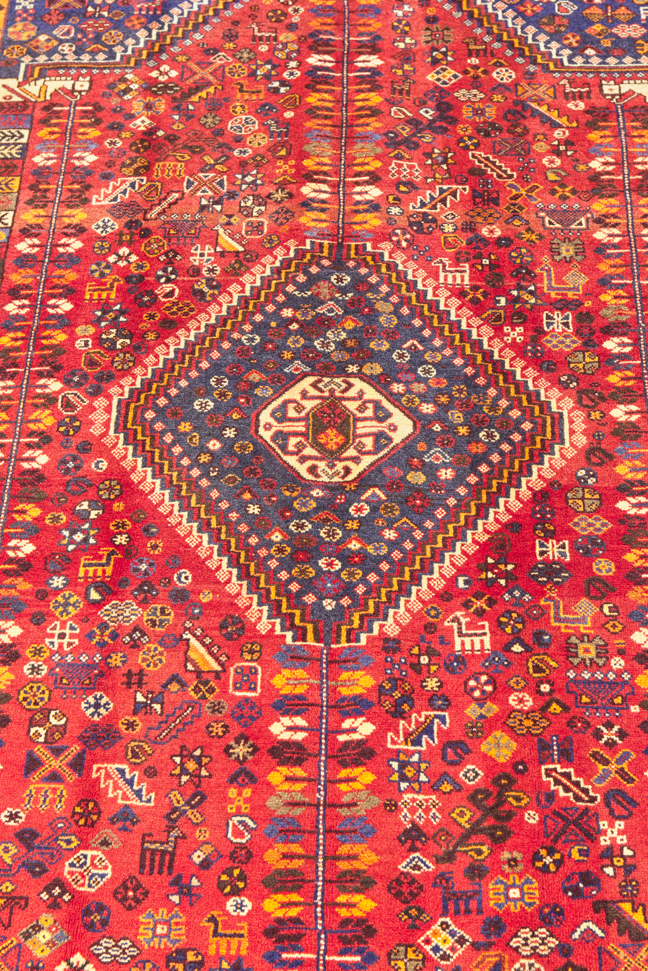 A TRIBAL PERSIAN QASHQAIE RUG. 100% WOOL. SOLID & DENSE PILE. TRIBAL WEAVE FROM THE FARS PROVINCE WITH DESIGN OF BOLD DIAMOND-SHAPED MEDALLION & CORNER MEDALLIONS CONTAINING AMULETS & FLORAL MOTIFS IN A RED FIELD OF "TREE OF LIFE" PATTERNS, FLORAL MOTIFS & BIRD & ANIMAL FORMS. GEOMETRIC-PATTERNED BORDER. GALLERY INVENTORY. IN EXCELLENT CONDITION. 282 X 162 CM. RRP $3200