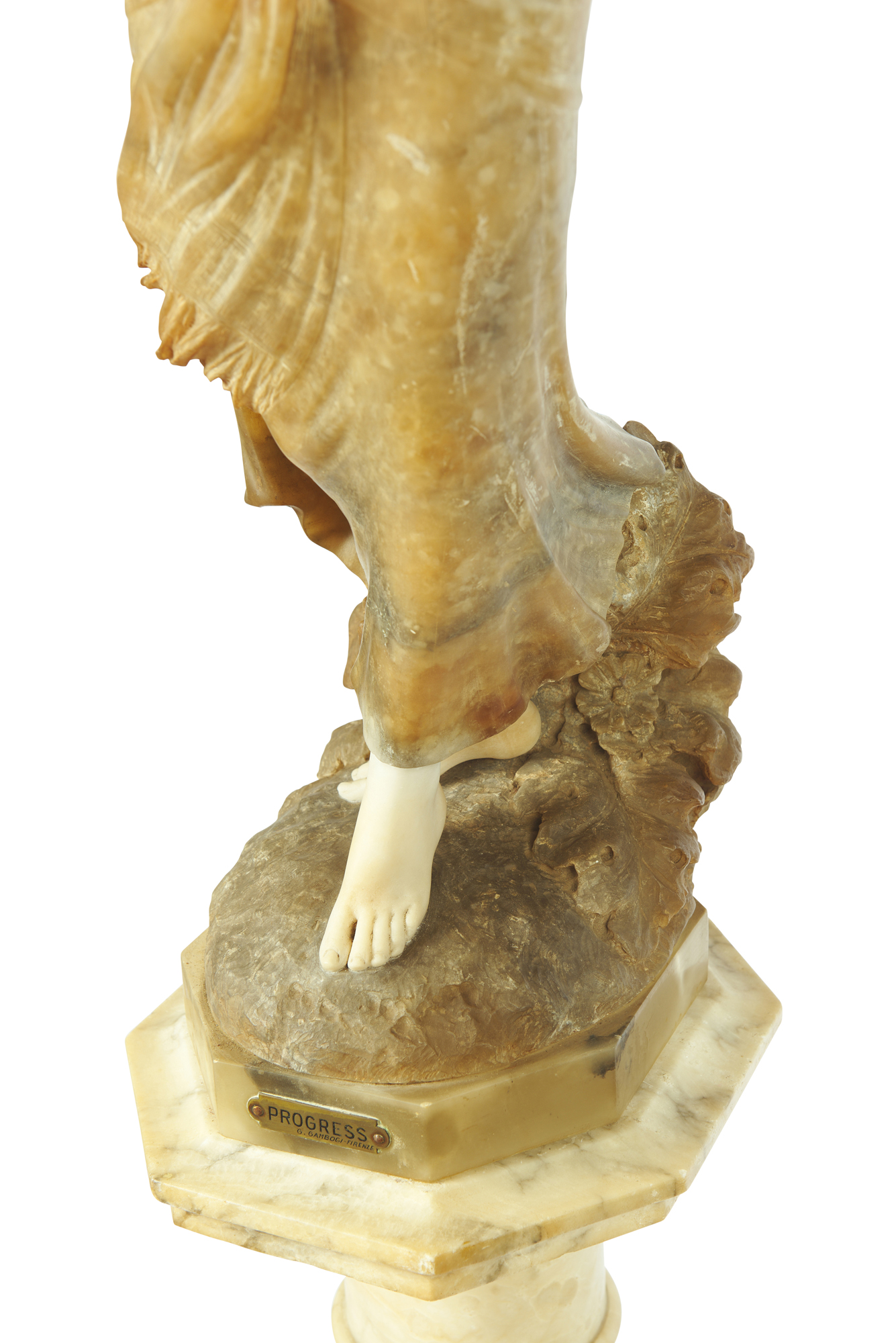 The figure modeled as a female, her dress beautifully carved from alabaster, standing in a celebratory pose and holding above her head a lidded urn functioning as a lamp, inscribed G. Gambogi to the base, the plaquette bearing 'Progress/G. Gambogi - Firenze', the marble pedestal with a slightly tapered column, and an octagonal top and base, inscribed 'made in Florence, Italy.