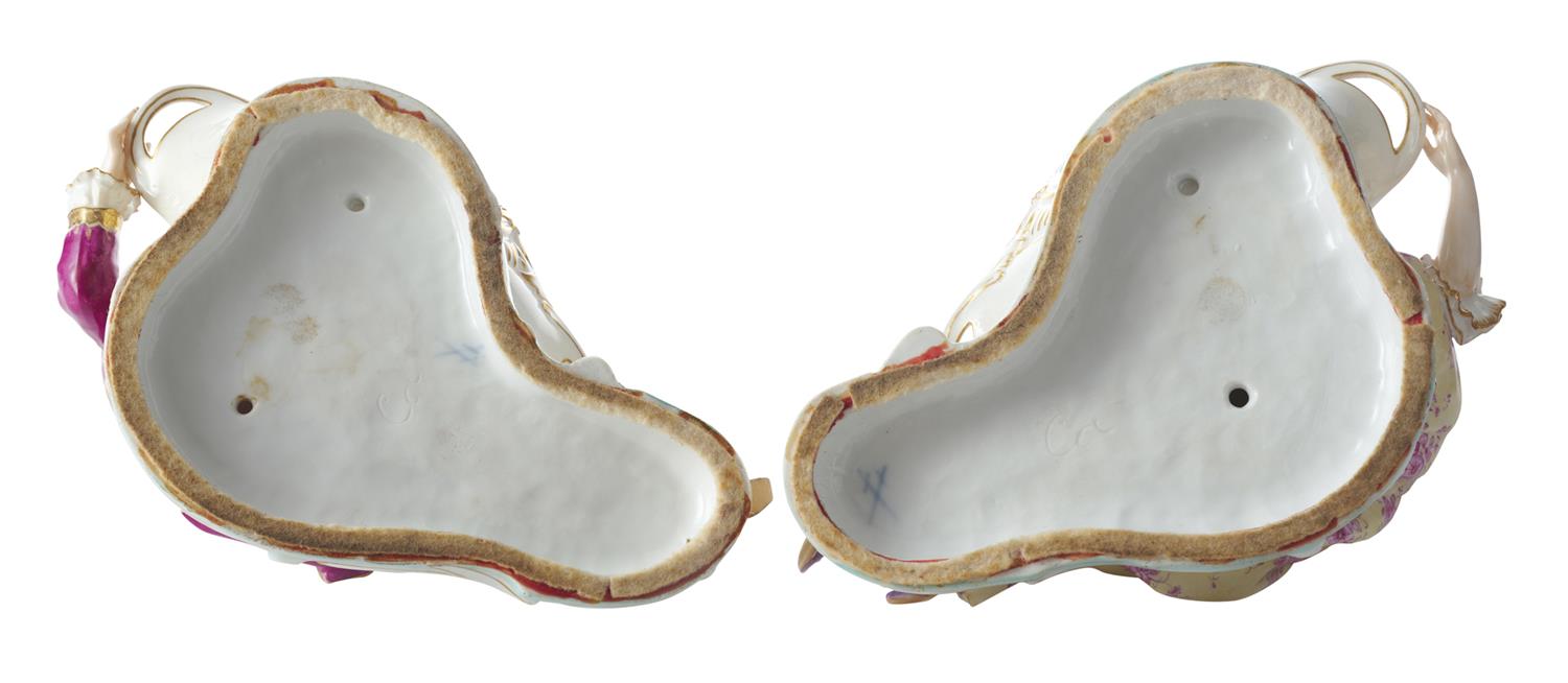 The dishes modelled as male and female figure, both mirrored in a recumbent position, holding a shaped dish. Under glazed blue crossed swords mark to base, (repaired)