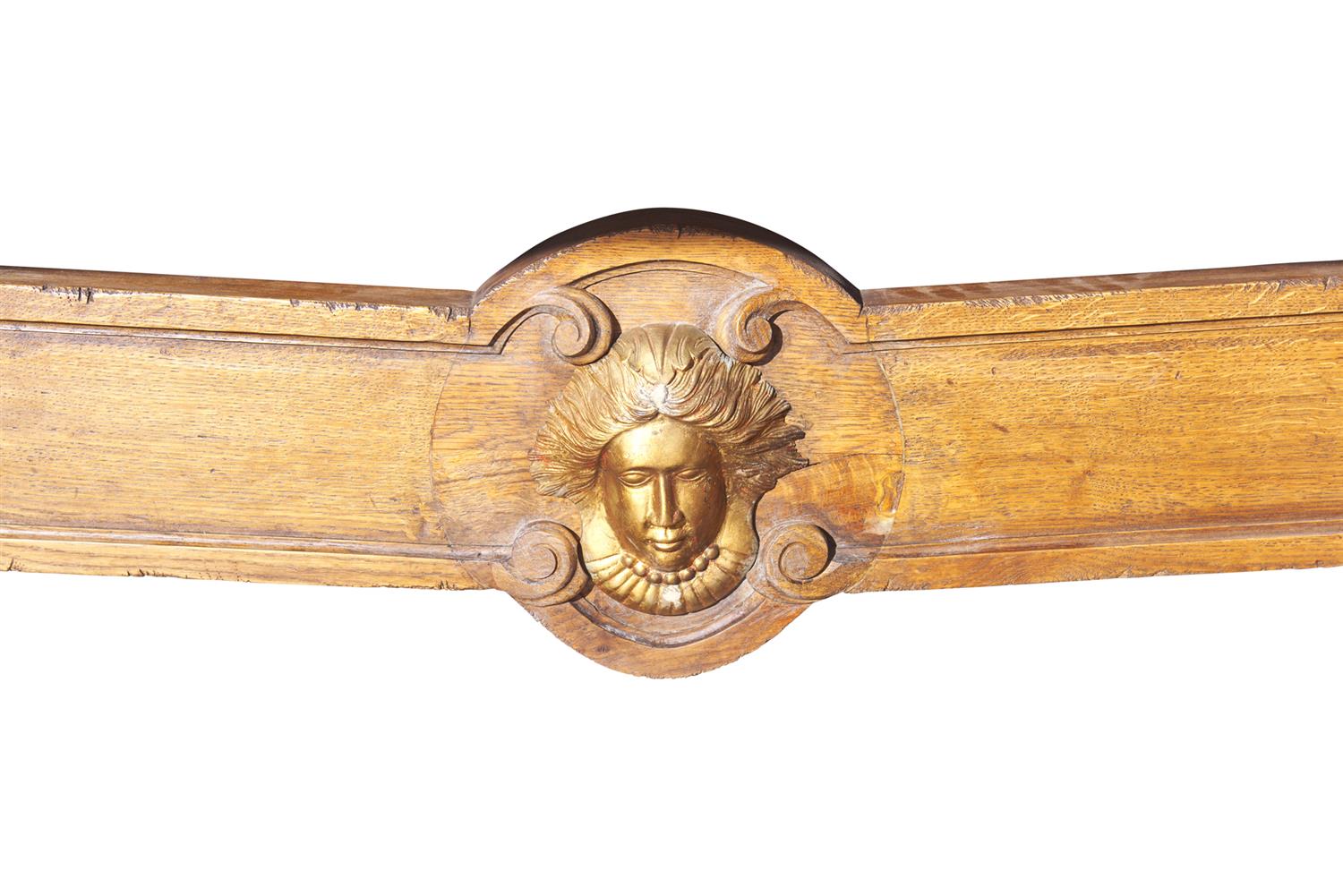 The parquetry top with marquetry decoration, sitting upon two solid oak pedestals each applied with gilded moulded plaques and ebonsied consoles, united with a stretcher centered with applied gilded masks