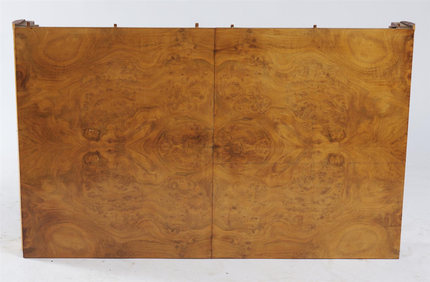 The curved rectangular top featuring bookmatched burr walnut veneer, the edge with a decorative carved foliate band, above an apron of conforming shape, raised upon two splayed pedestals decorated with roundels, terminating on moulded bases united with a stretcher, the table extending with one spare leaf