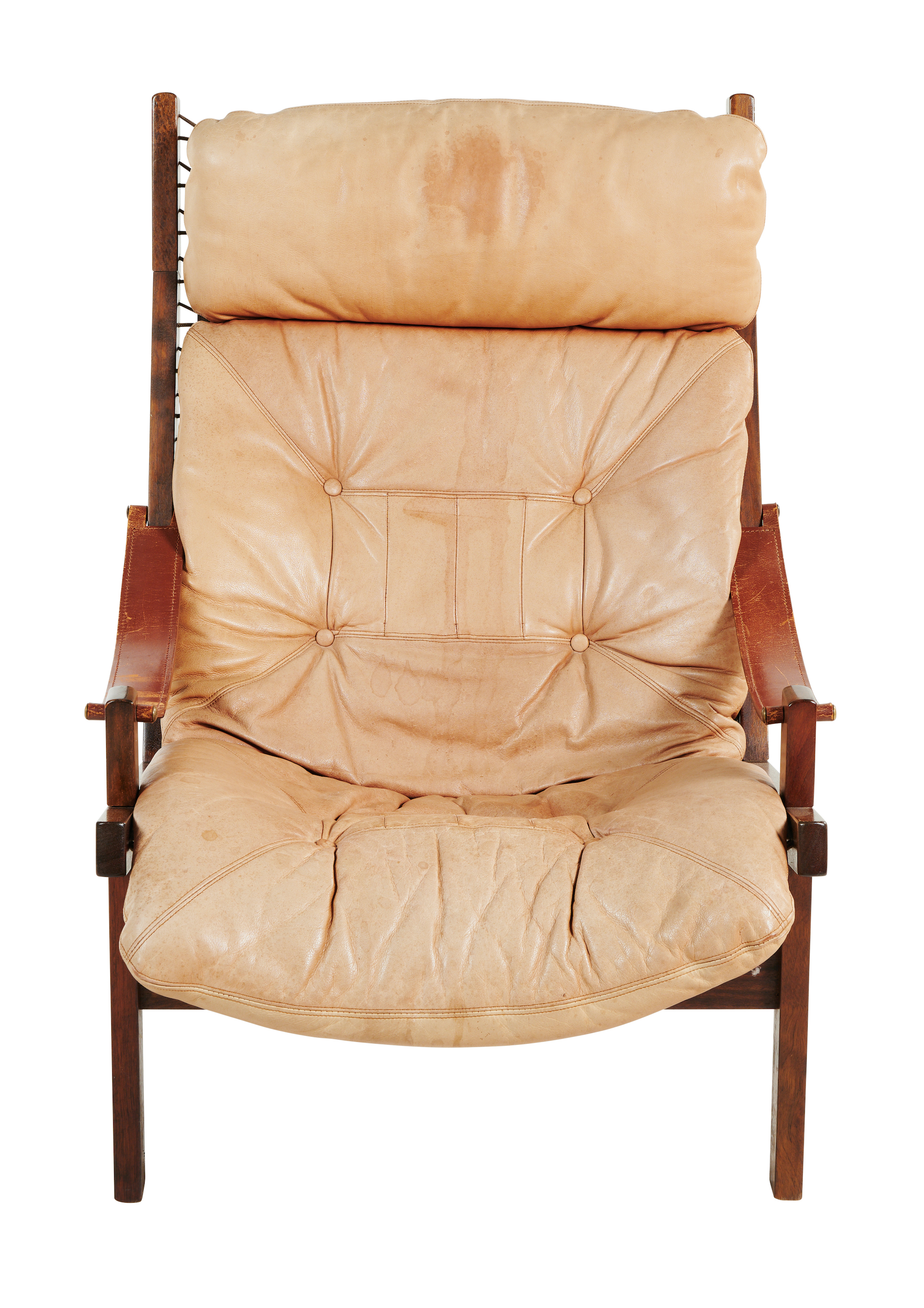 Coffee coloured button back leather on hardwood frame with brown leather straps