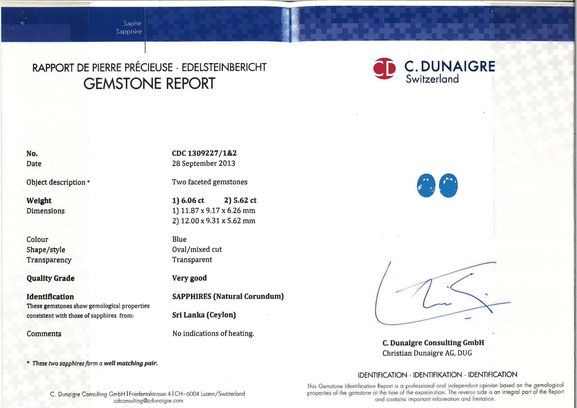 Accompanied by a C. Dunaigre report numbered CDC 1309227/1&2, dated 28 September 2013, stating that the 6.06 carat and 5.62 carat sapphires are natural, with no indications of heating, and of Sri Lankan (Ceylon) origin.
