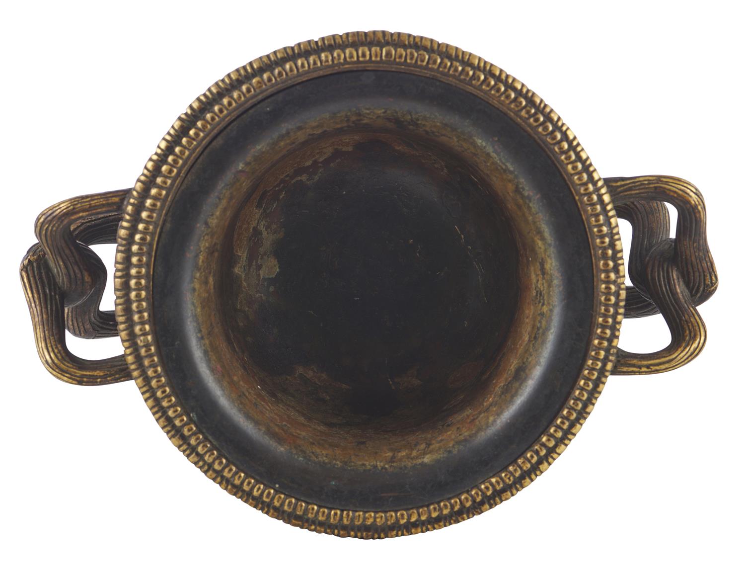 evidence of age and wear to interior of urn. The exterior urn appears to have been restored, old patina is no longer visible. Wear to underside of plinth including original leather base partially missing.