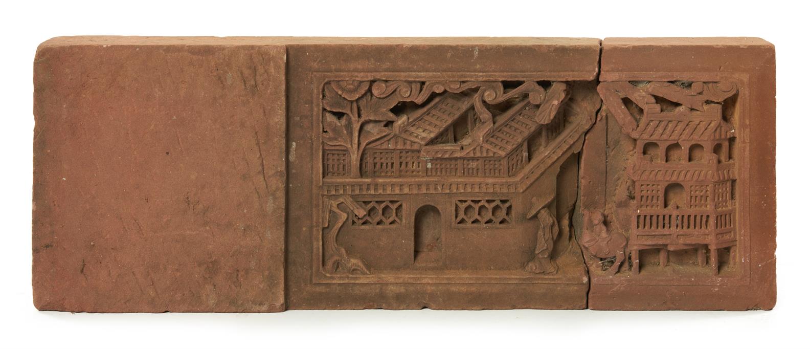 Carved from pink sandstone, the largest element decorated with four large characters. All elements decorated with figural scenes.