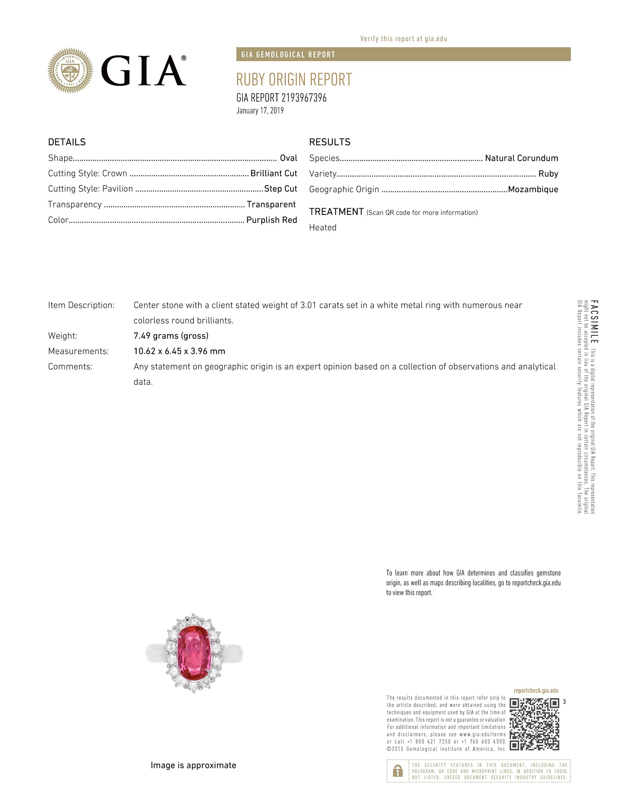 Accompanied by a GIA report 21993967396, dated 17 January 2019, stating that the 3.01 carat natural ruby is purplish red colour, and is of Mozambique origin.