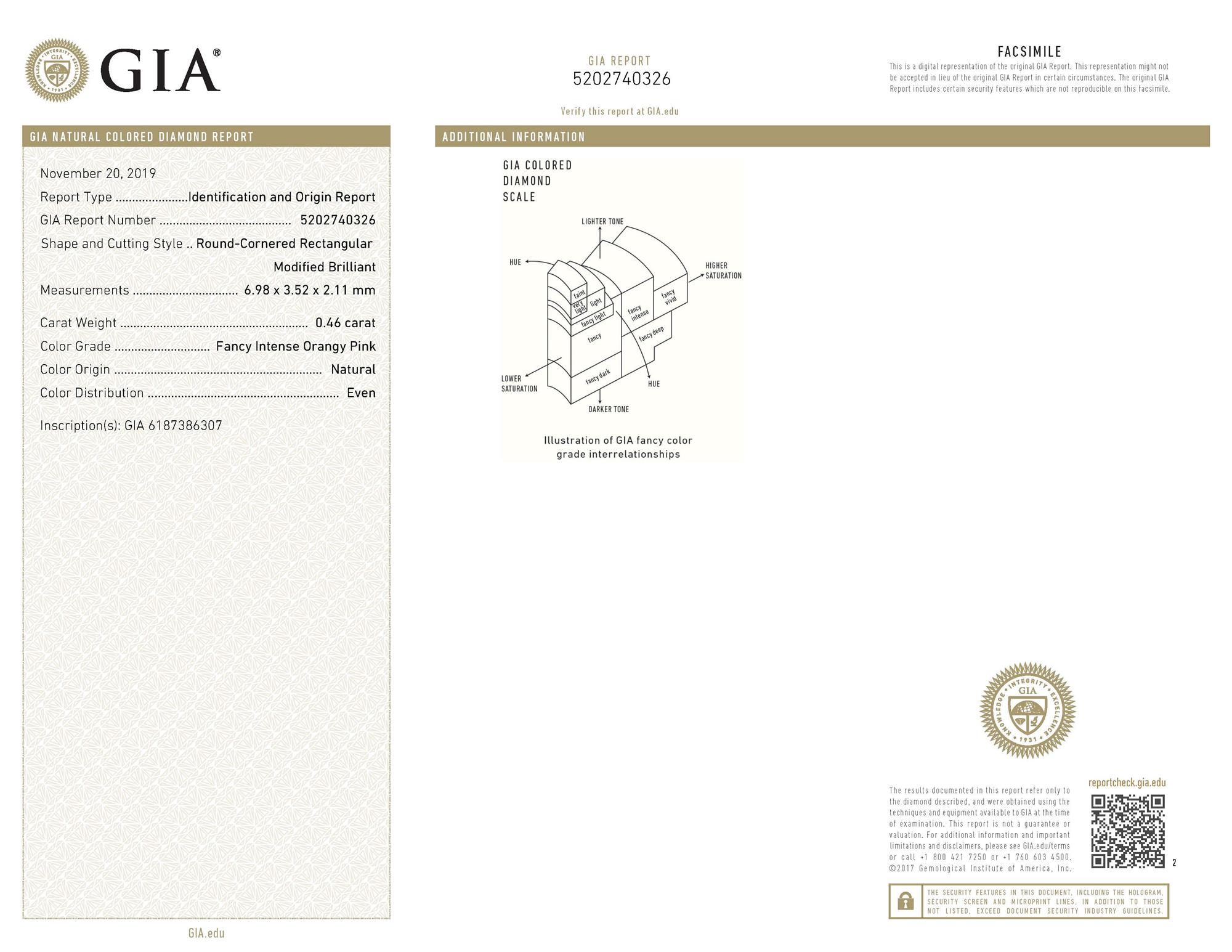 Accompanied by a GIA report numbered 5202740326, dated 20 November 2019, stating that the 0.46 carat diamond is natural, fancy intense orangy pink colour, laser inscribed.
