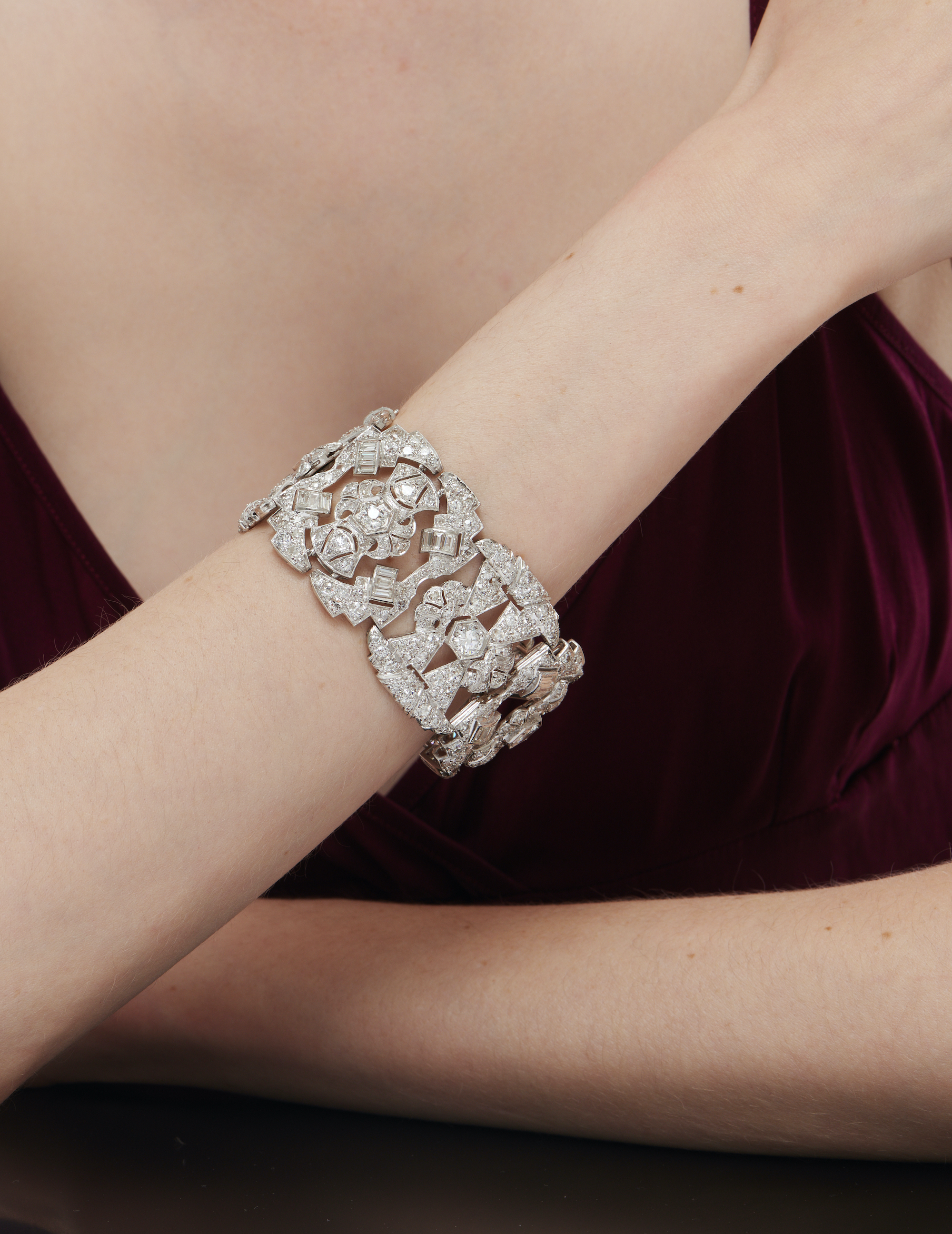 The Art Deco bracelet is modelled as an articulated line of openwork geometric links decorated with baguette and circular-cut diamonds together weighing approximately 34.66 carats, circumference approximately 175mm.