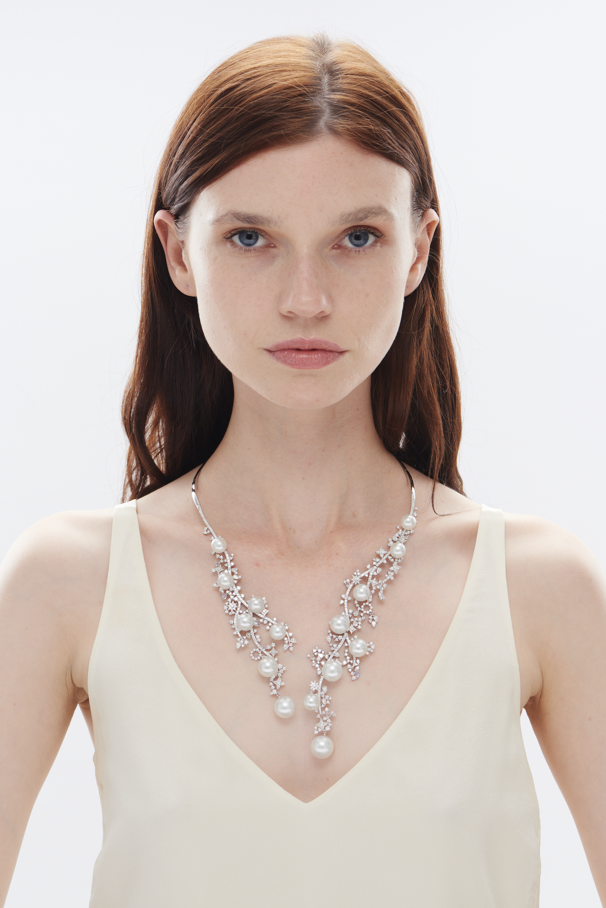 The torque collar decorated to the front with foliate motifs embellished at intervals with South Sea cultured pearls graduating from approximately 9.00mm-14.00mm, white moonstones and claw-set pear, brilliant and princess-cut diamonds, the diamonds together weighing 13.39 carats, signed Autore.