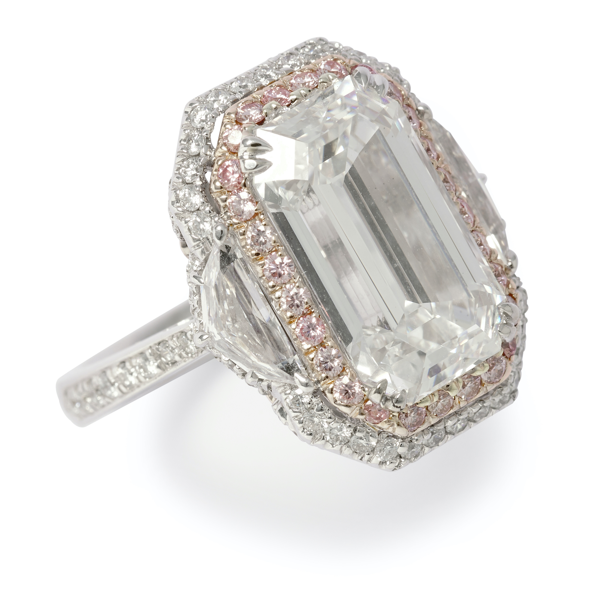 Of cluster design, centring a claw-set emerald-cut diamond weighing 7.09 carats framed by a line of Argyle natural fancy purplish pink brilliant-cut diamonds, further framed by a line of pavé-set near colourless diamonds, flanked by two near colourless trilliant diamonds together weighing approximately 1.12 carats, the underrail decorated with pavé-set near colourless and Argyle natural fancy purplish pink diamonds, the near colourless and purplish pink diamonds together weighing approximately 0.88 carat and 0.43 carat respectively, size L1/2.