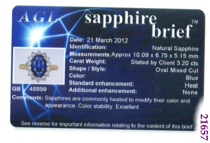 Accompanied by an AGL report numbered GB48899, dated 21 March 2012, stating that the 3.20 carat sapphire is natural.