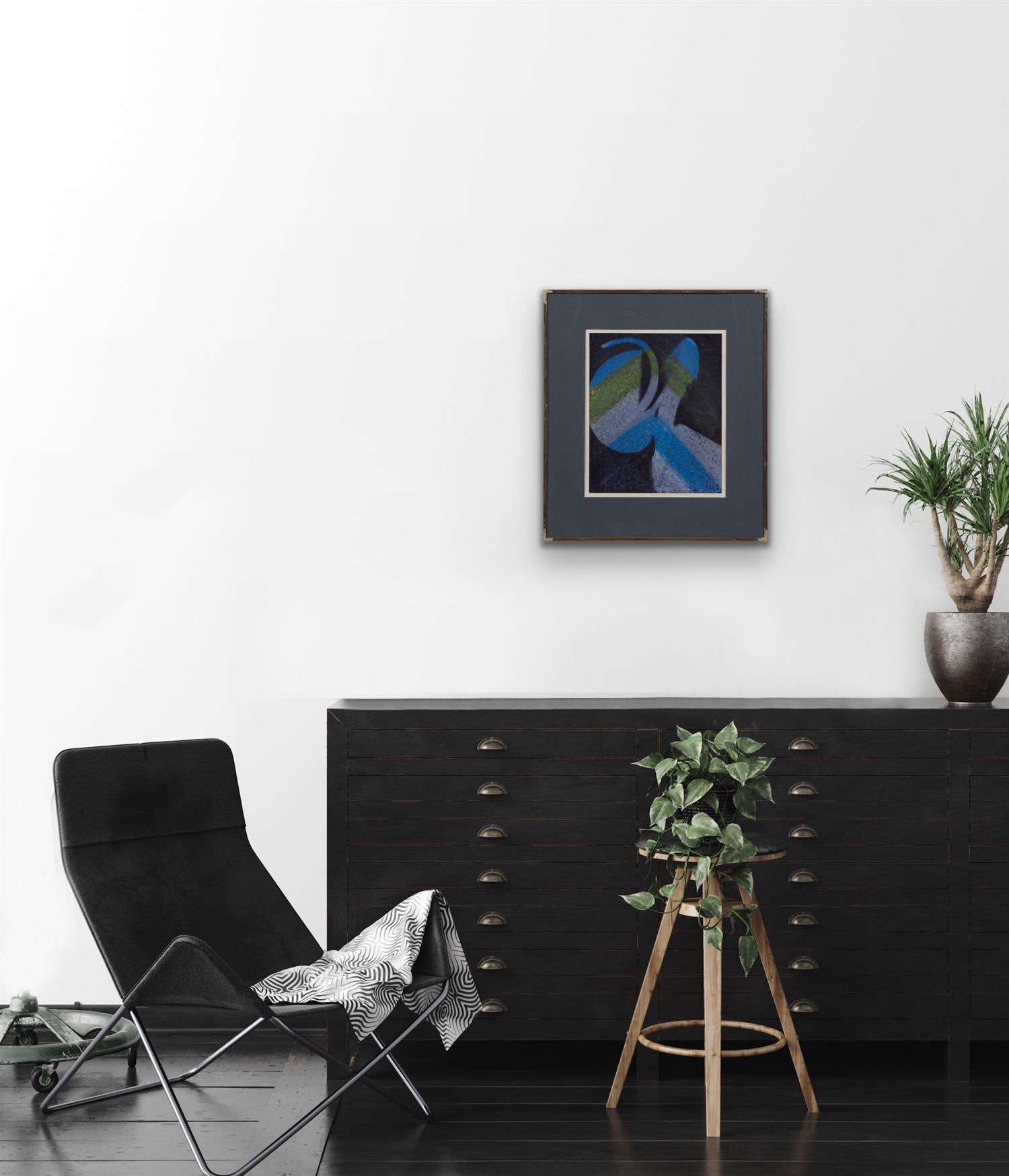 Good condition overall with minor cockling to the paper. A small crack to the glass in the upper left. Light condensation visible beneath the glass, however does not appear to have damadged the artwork. Overall size: 47.5 x 42cm