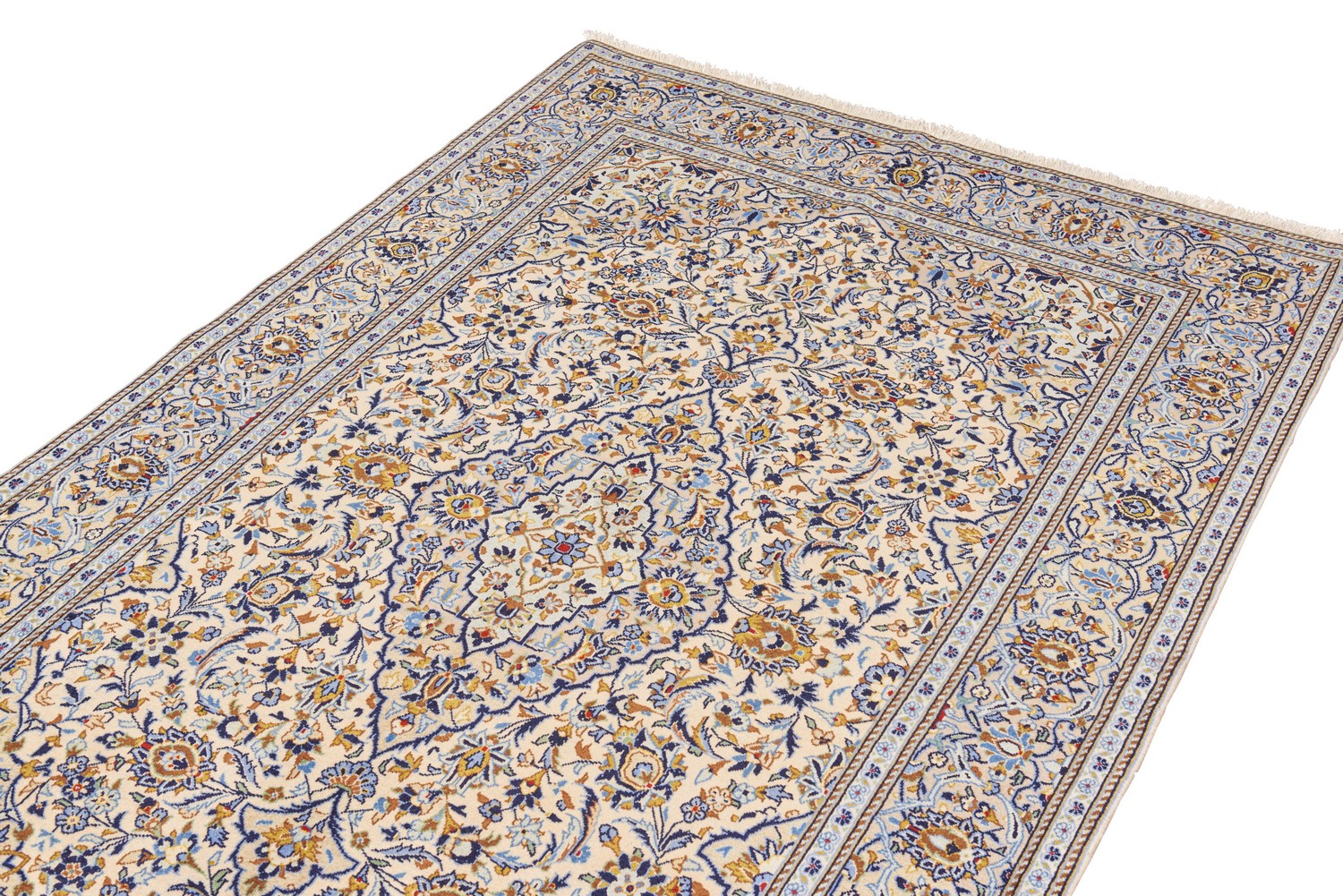 A SUPERFINE PERSIAN KASHAN CARPET. 100% Kork (lamb) wool pile. Solid & dense pile. Finely hand-knotted city weave of 500,000 knots per square meter from the Isfahan province. Classic Kashan book cover design of chandelier medallion of palmettes and quartered corner medallions in a cream field of 16th century Shah Abbassi palmettes, floral sprays & tendrils. Border of palmettes & tendrils. Gallery inventory. In pristine condition.Certificate of authenticity included. SIZE: 224X140 ORIGIN: PERSIA RRP: $4900
