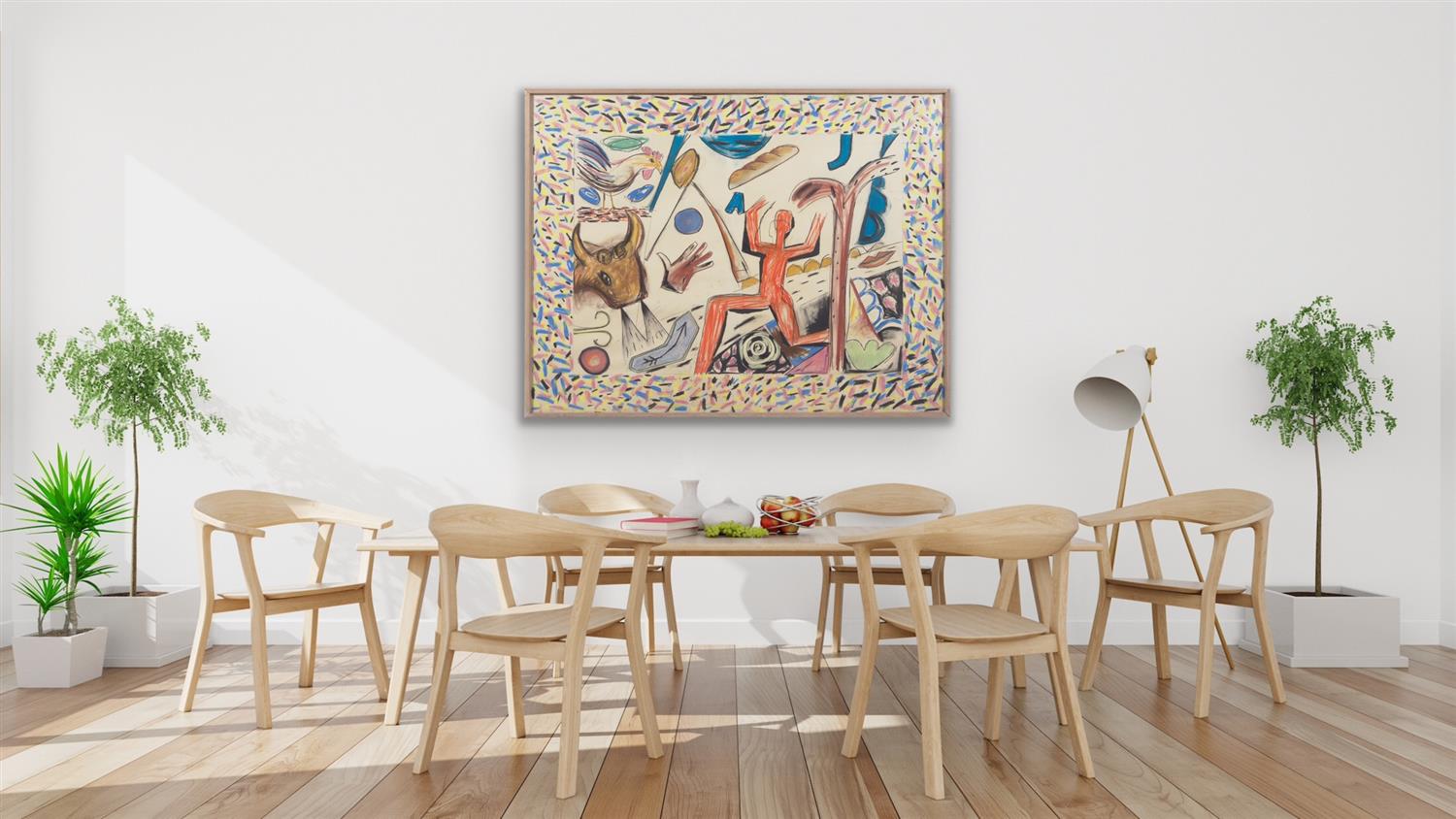 The work is in overall very good condition. There is a crease in the paper visible in the centre, just left of the figure. The paper is slightly cockled, likely from having moved within the frame. The frame is slightly unstable, the perspex has pulled down and popped out from the frame in the upper centre. It is recommended that this be restabilised in the current frame. Overall size 134 x 160cm.