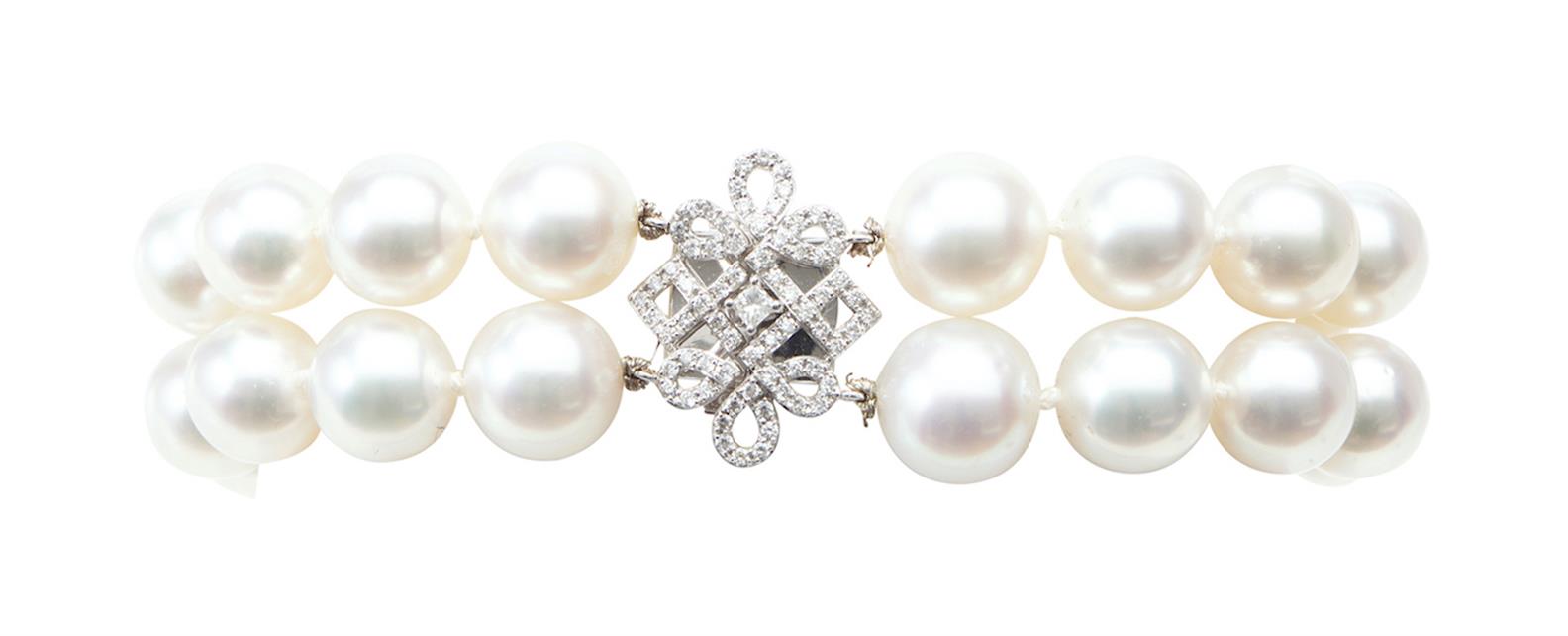 The double row bracelet comprising thirty four near round pearls of silver white hues measuring 10.92mm to 9.30mm, to a decorative clasp set with round brilliant and princess cut diamonds totalling 1.207cts, in 18ct white gold, total length 190mm.