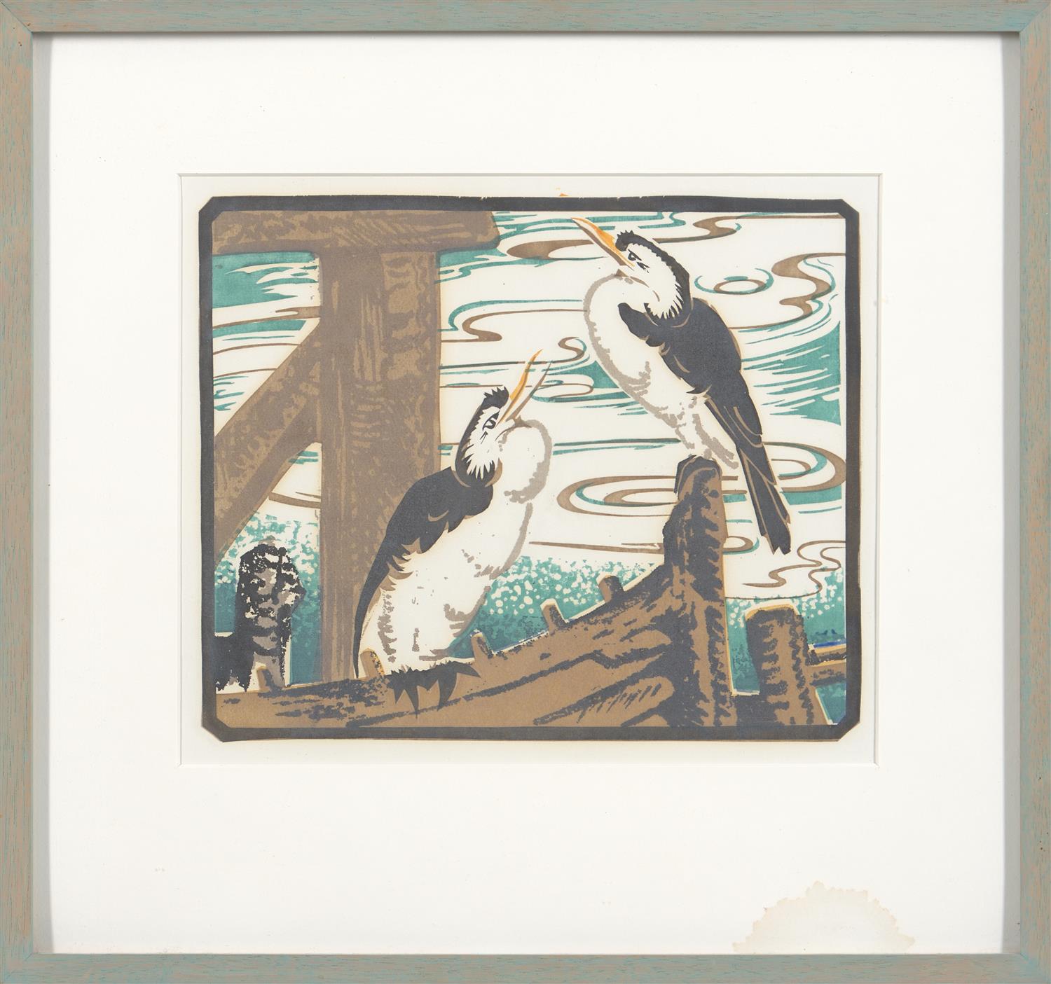 This work is in good condition with a few issues to take note of. There is areas of yellowing seen throughout the work and some light cockling to the paper. There is a stain lower right on the mount, which does not affect the image.