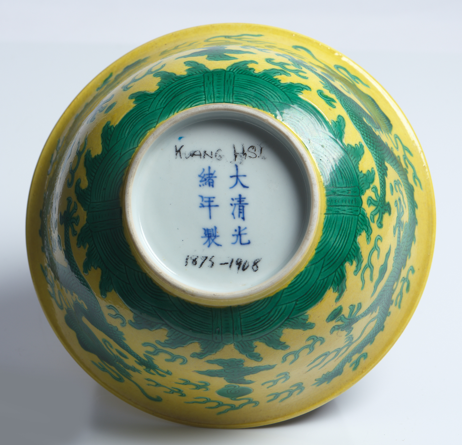 With incised decoration of two dragons chasing flaming pearls to the sides, covered in yellow and green enamels. Six character Guangxu mark in underglaze blue to the base.