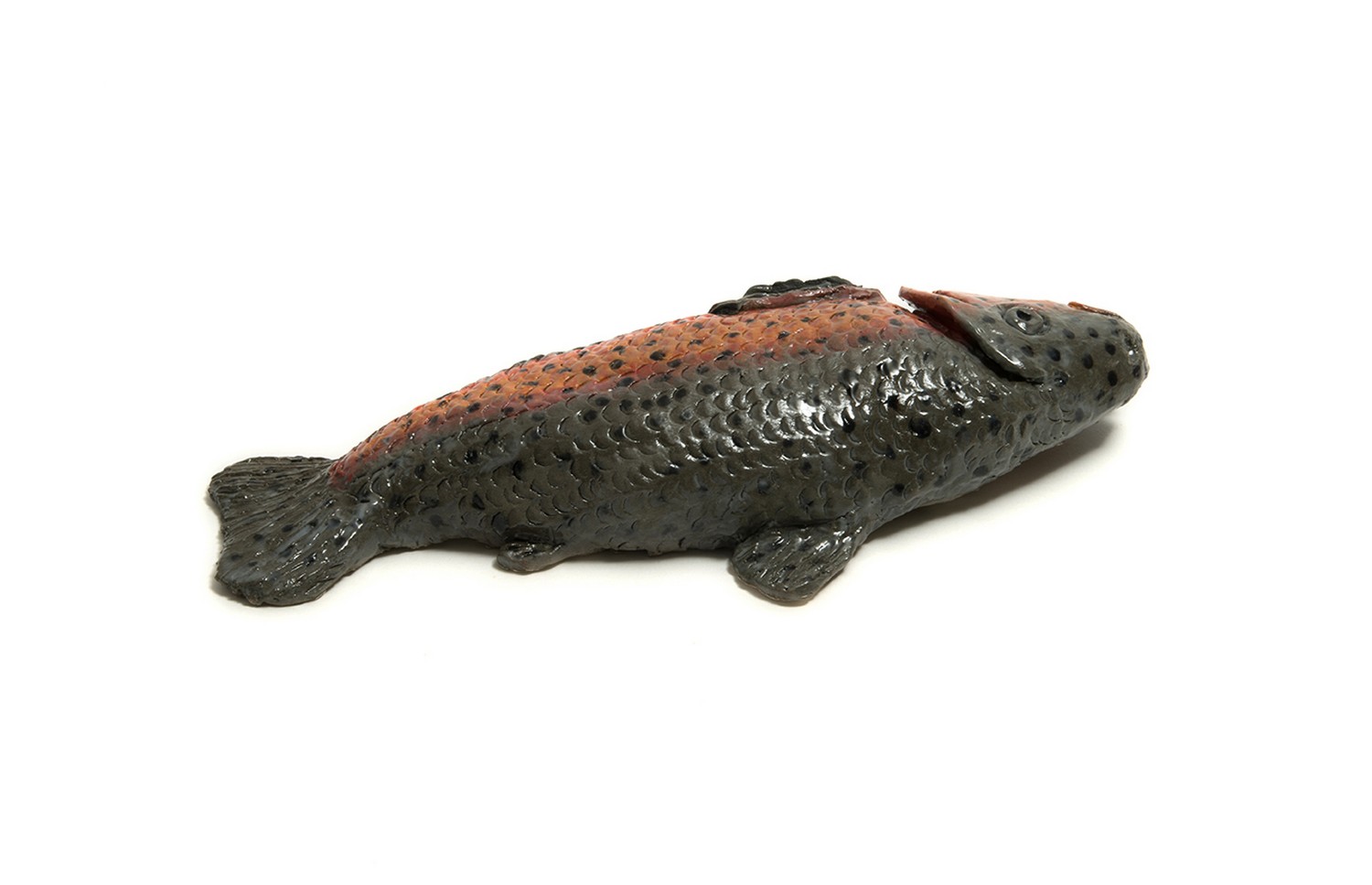 In Mason's ceramic practice reptiles and fish appear often. Rainbow Trout with a Black Underbelly is a great example, the textured scales bouncing light off the peach-gold streak through its belly.
