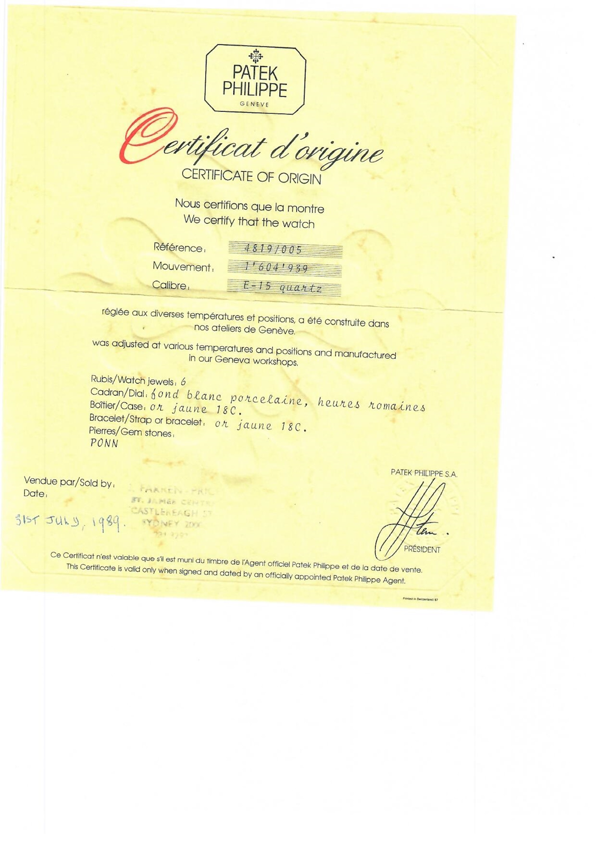 Accessories: Accompanied by a Patek Philippe Certificate of Origin confirming its sale on 31 July 1989 and box.