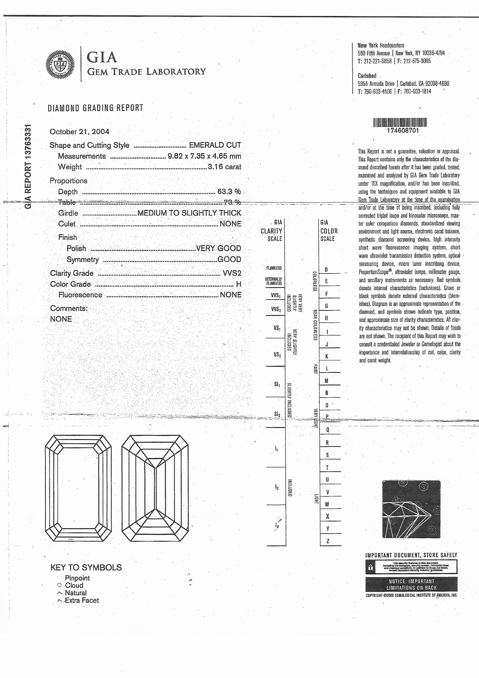 Accompanied by a GIA report numbered 13763331, dated 21 October 2004, stating that the 3.16 carat diamond is H colour, VVS2 clarity.