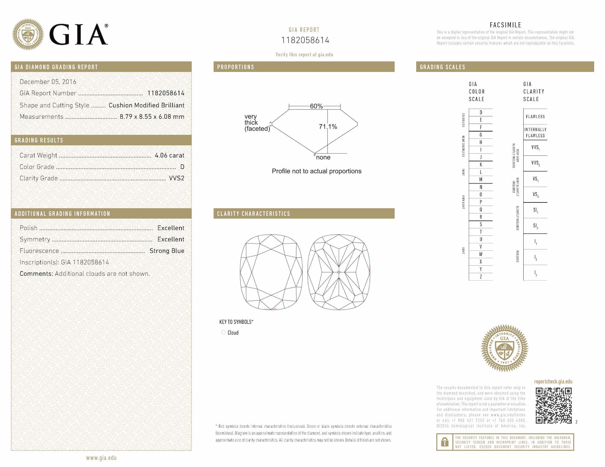 Accompanied by a GIA report numbered 1182058614, dated 5 December 2016, stating that the 4.06 carat diamond is D colour, VVS2 clarity, laser inscribed.