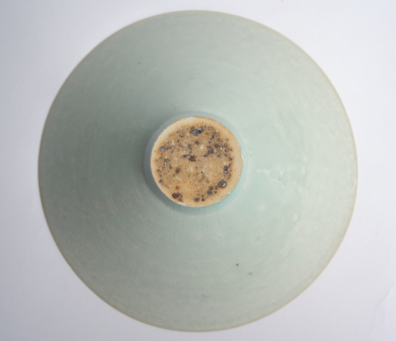 Perfectly conical and finely potted, with carved decoration to the interior of scrolling flowers, the whole covered in a fine pale blue glaze, the foot unglazed.