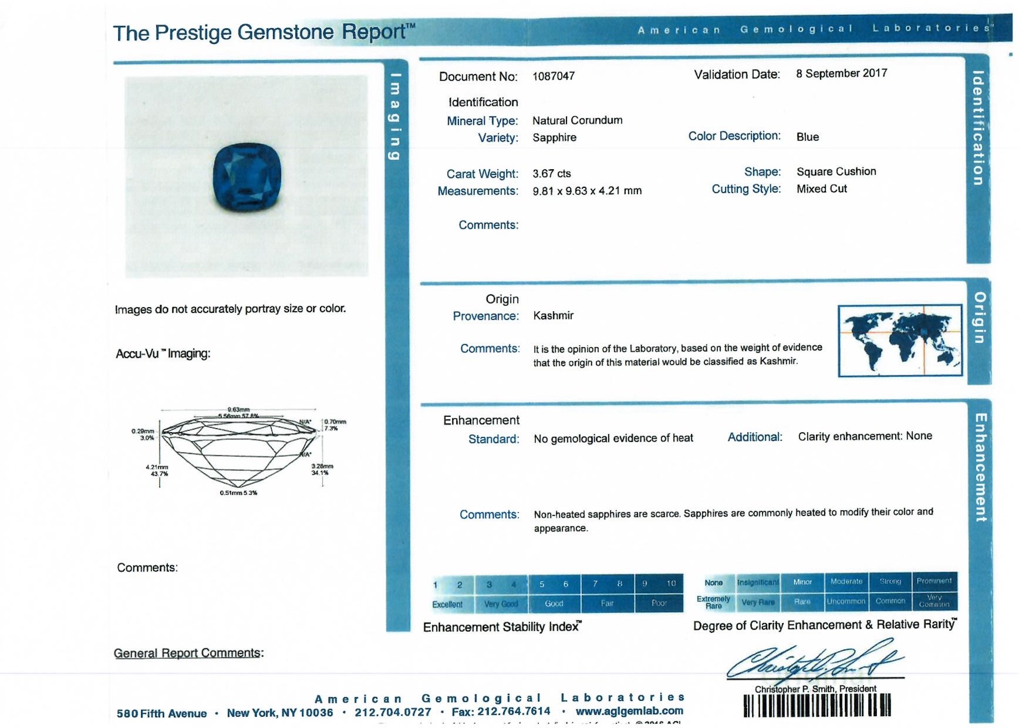 Accompanied by an AGL report numbered 1087047, dated 8 September 2017, stating that the 3.67 carat sapphire is natural, with no indications of heating, of Kashmir origin.