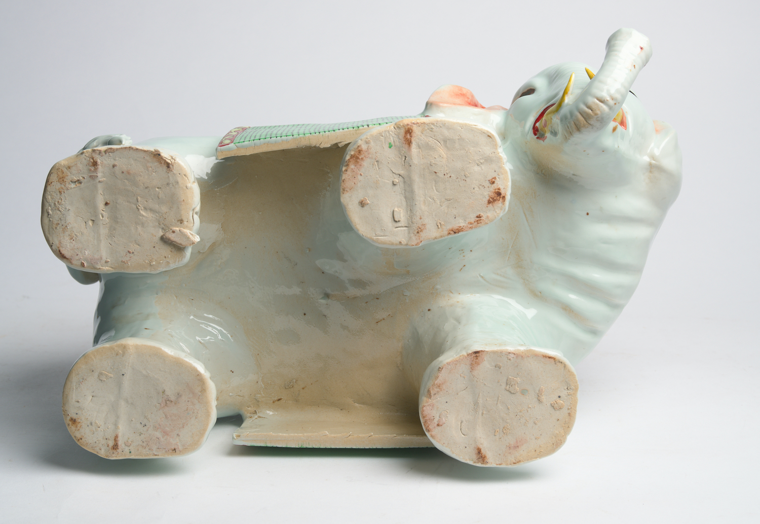Modelled as a caparisoned elephant carrying an archaistic 'zun' on its back, decorated in famille rose enamels.