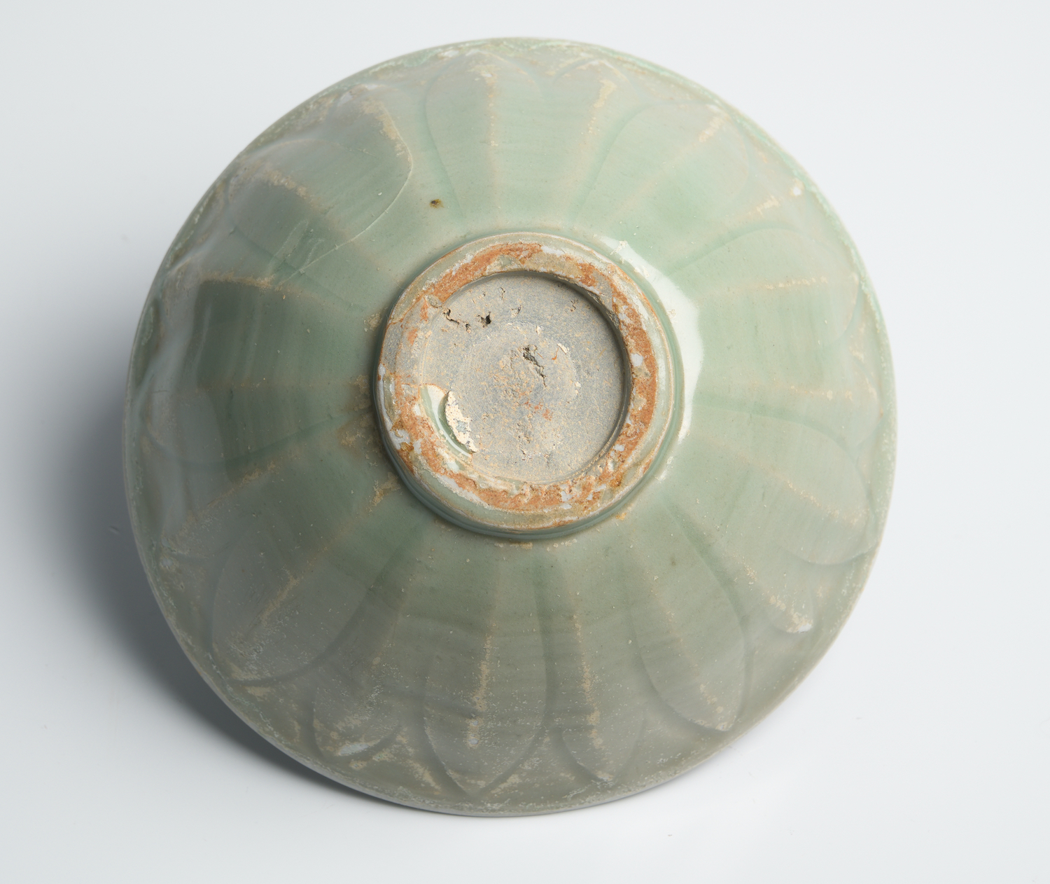 Finely carved to the exterior with lotus petals, covered in a pale celadon glaze over the grey stoneware body.
