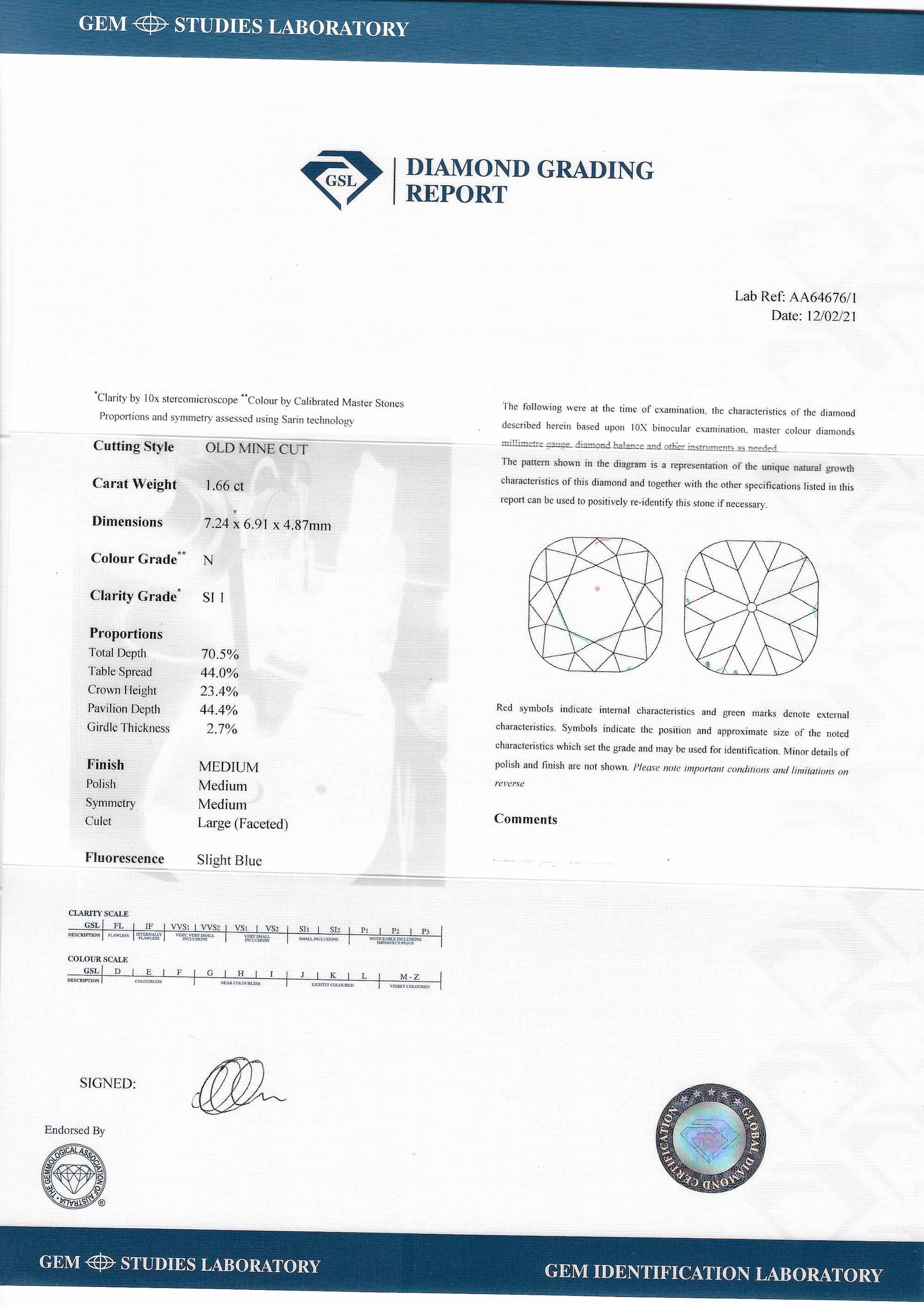 Accompanied by a GSL report numbered AA64676/1, dated 12 February 2021, stating that the 1.66 carat diamond is N colour, SI1 clarity.