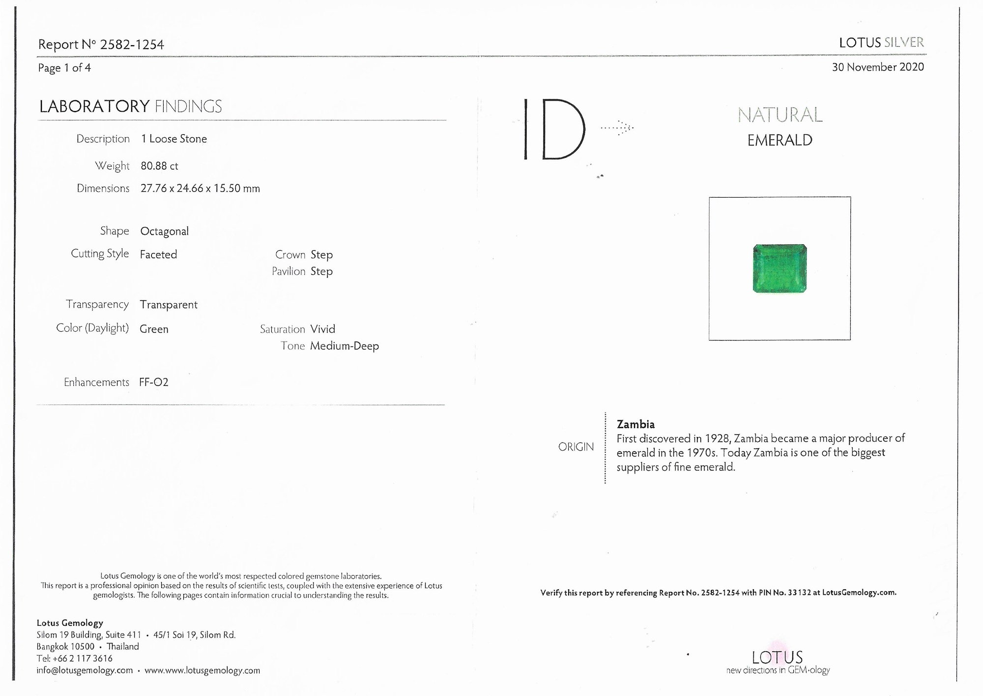 a Lotus Silver report numbered 2582-1254, dated 30 November 2020, stating that the 80.88 carat emerald is natural, of Zambia origin.