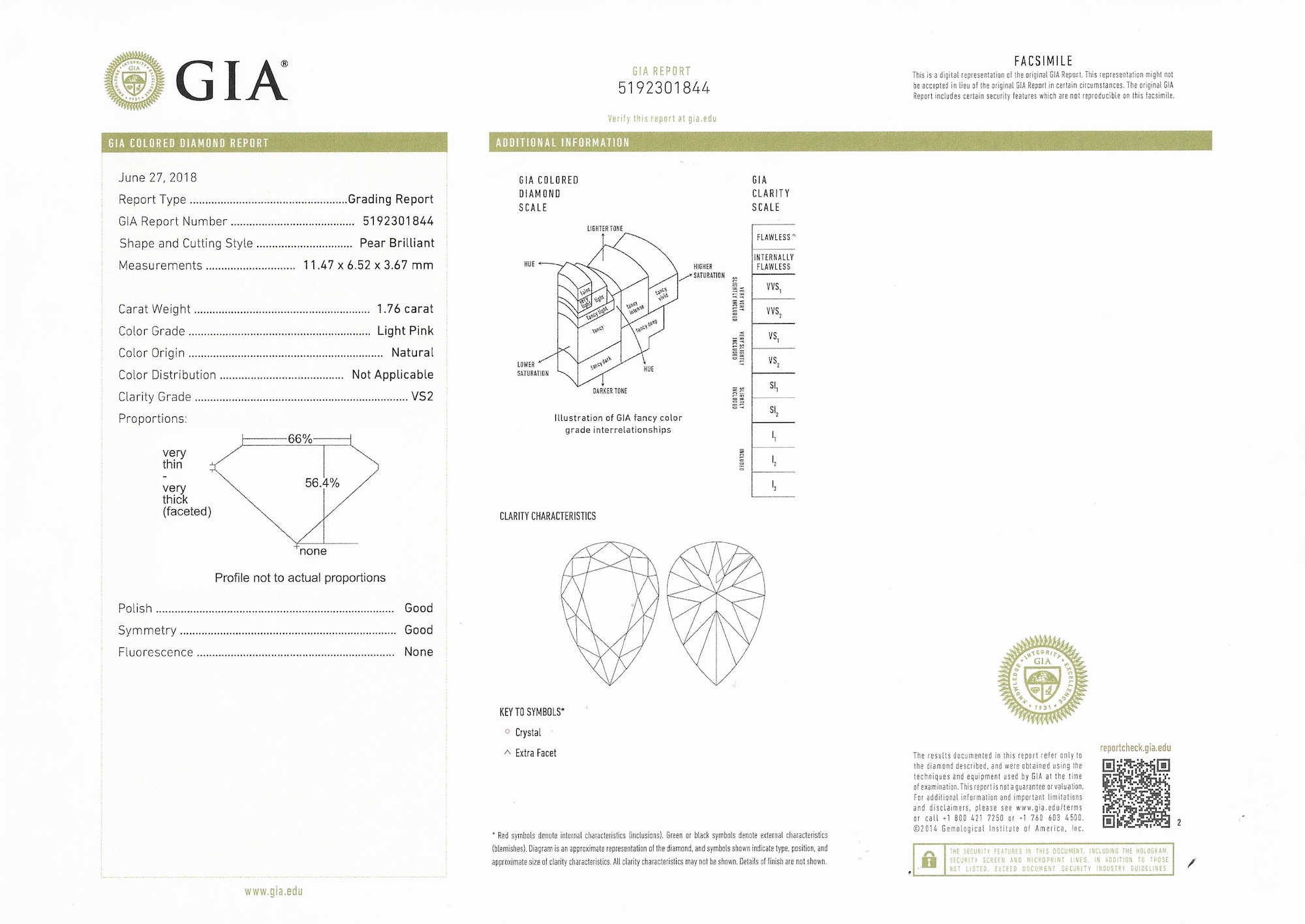 a GIA report numbered 5192301844, dated 27 June 2018, stating that the 1.76 carat diamond is natural, light pink colour, VS2 clarity;