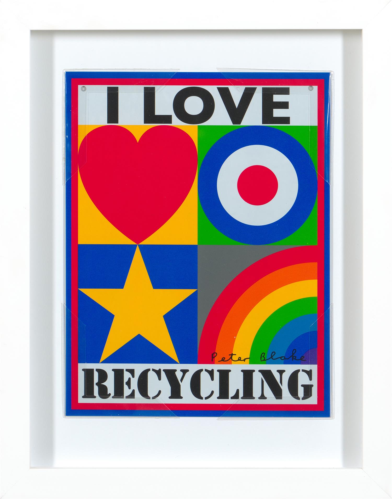 Peter Blake's tin-plate wall sign I Love Recycling blends iconic printmaking with environmental consciousness. Made in collaboration with Creatively Recycled Empire, I Love Recycling was first unveiled at the 2009 National Recycling Awards, held at the Hilton Park Lane.