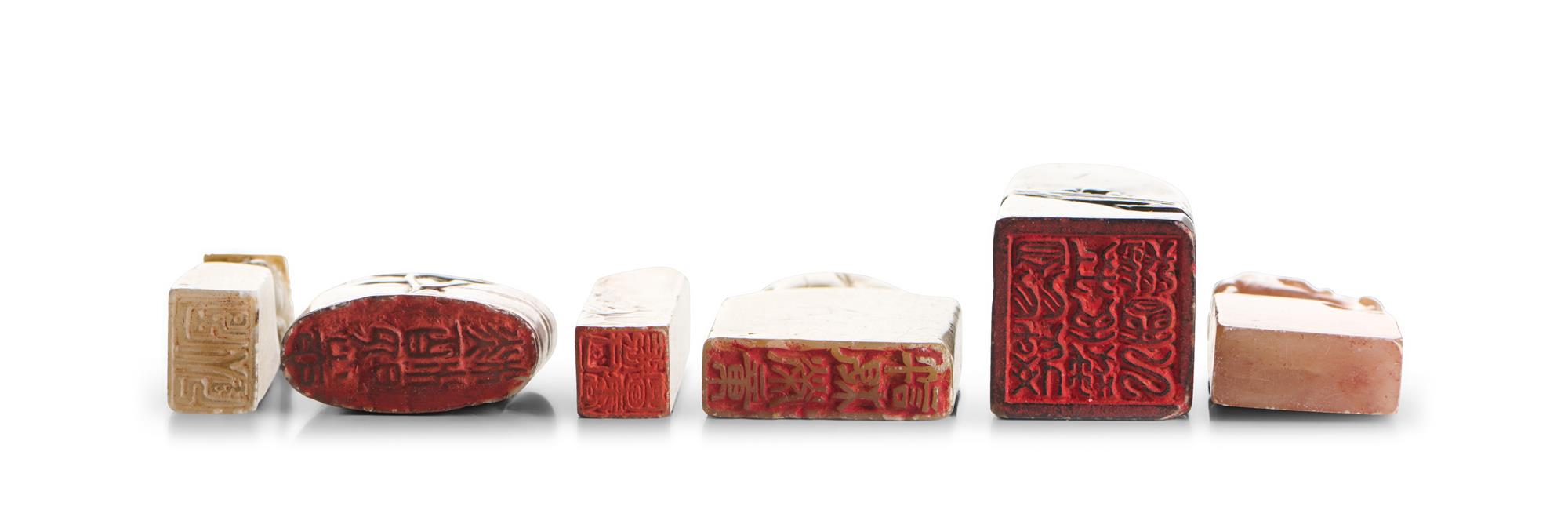Comprising: a larger dark brown seal with relief carved prunus, and a nine character mark to the base; an inscribed yellow stone seal with a male figure and a four character mark to the base; a pink stone seal with qilong decoration; a chicken's blood stone seal in the form of a bamboo segment with a four character mark to the base; a yellow and white stone seal with low relief lotus carving and a four character mark to the base; and a white and yellow stone seal decorated with a qilong and coin with a three character mark to the base.